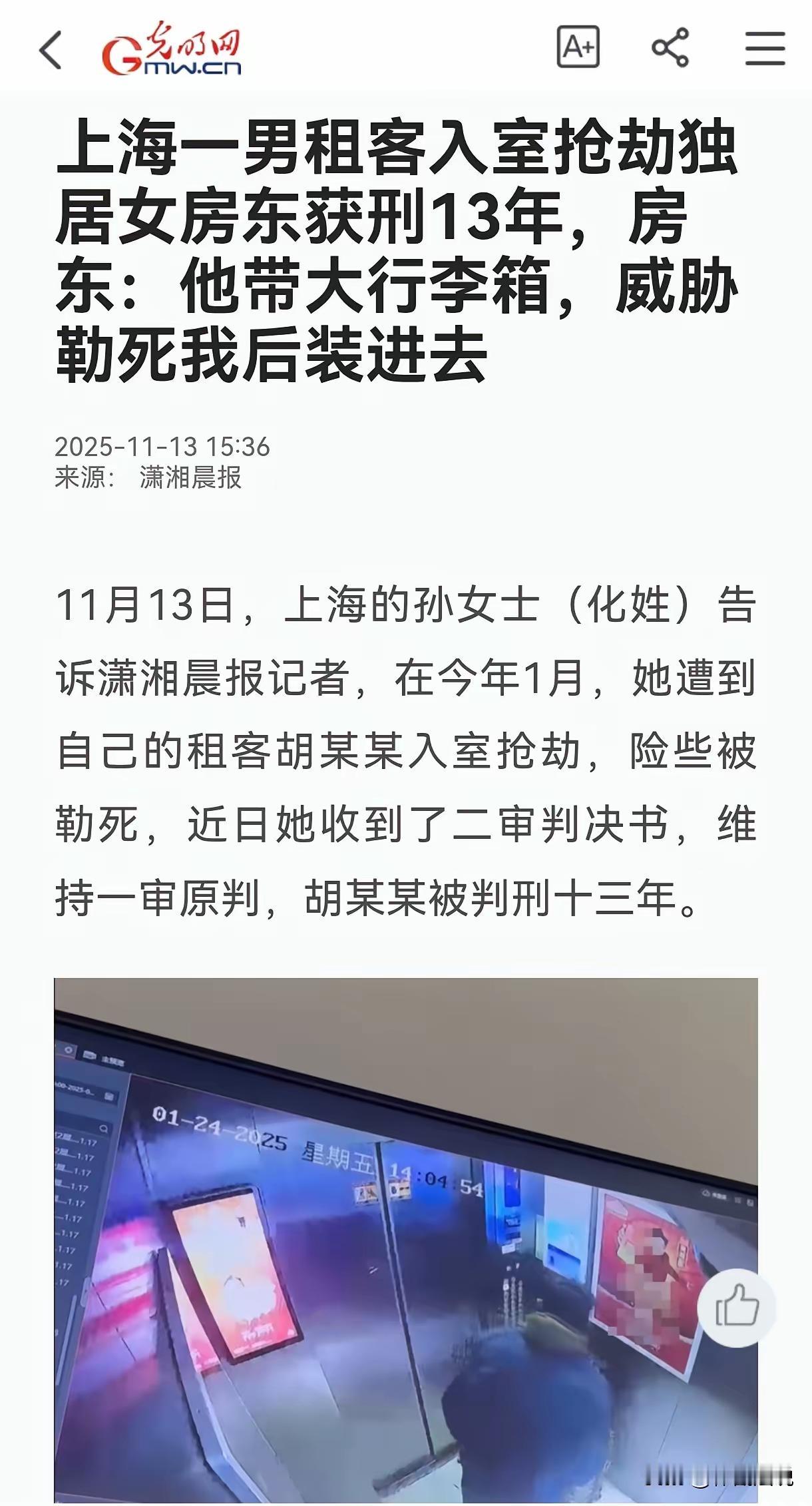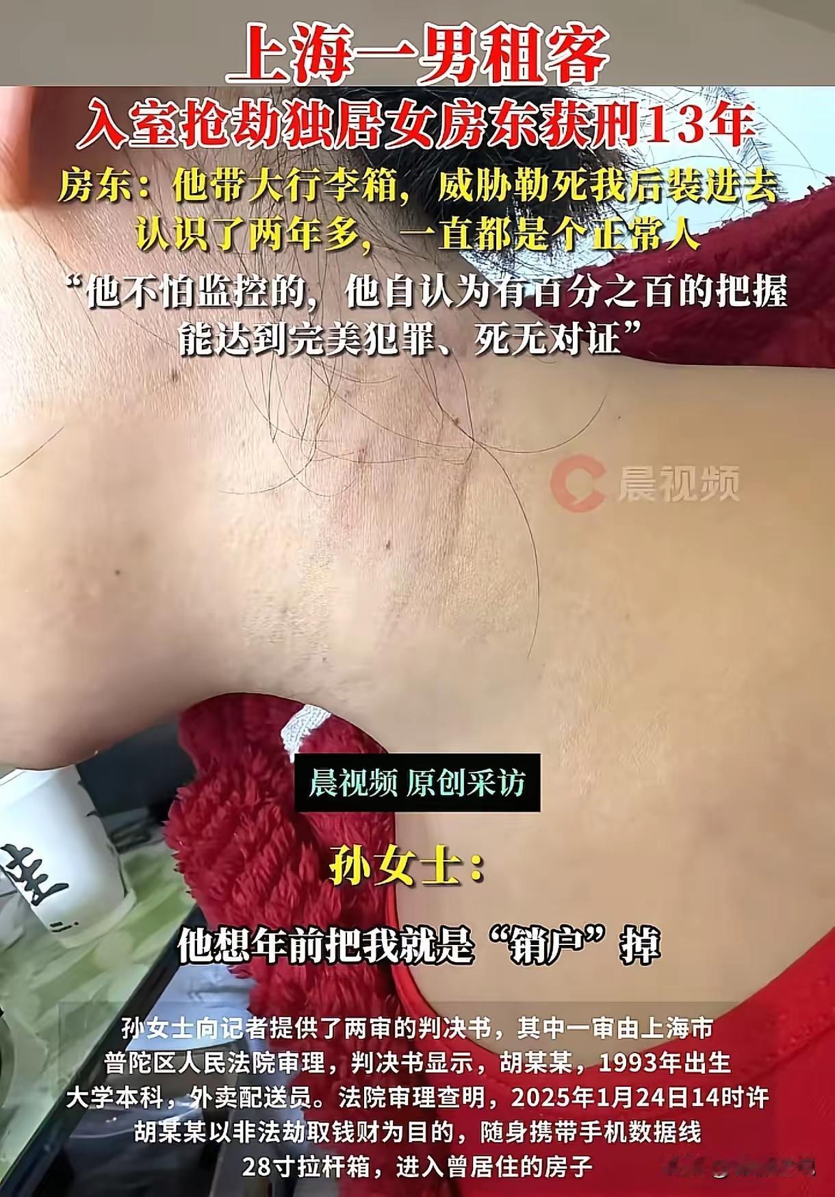 这起事件反映出许多值得我们深思的问题,也提醒我们在日常生活中要加强安全防范。以下是对事件的分析与几点建议: 一、案件回顾总结 胡某租住孙女士的房屋两年多,双方关系曾较为正常。 胡某在退租后,一方面伪装正常,另一方面策划了抢劫行动。 当日,他利用孙女士午睡时,悄悄潜入并以暴力胁迫,逼迫其交出手机和银行卡密码。 孙女士在生命受到威胁的情况下,选择转账5万元保命,并在危机解除后及时求助警方。 警方及时行动,将胡某绳之以法。 二、法律分析 胡某的行为符合《刑法》第263条关于抢劫罪的定义,情节严重,判处13年有期徒刑是合理且符合法律规定的。 胡某在案发后拒不认罪,法院坚持判决,体现了法律对人身安全和财产安全的严肃态度。 受害人孙女士的勇敢求助也体现了面对危机时的正确应对策略。 三、防范建议 安全措施: 独居女性应及时更换门锁,安装安全门锁和监控设备。 保持家中门窗的紧闭,尤其在外出或休息时。 提升警惕性: 对陌生来访者保持警惕,不轻易透露密码等敏感信息。 如有人要求提供个人信息或资金,应第一时间报警或寻求帮助。 邻里关系: 建立良好的邻里互助关系,一旦出现异常,能及时相互关照。 自我保护: 学习一些自我防卫技能,增强应对突发事件的能力。 四、社会反思 网络和现实生活中应警惕陷入“人不可貌相”的误区,不能只以外表或表面言行判断人品。 经济压力大的人可能会做出违法犯罪的事情,我们应加强社会扶持和帮助,减少因贫困带来的犯罪动机。 法律应对犯罪保持零容忍态度,保护弱势群体的安全和权益。 五、孙女士的心声 她的勇敢让我们认识到遇到危机时应保持冷静、果断,及时寻求帮助。 希望此类事件能引起更多女性的重视,加强自我保护意识。 总结: 这起案件再次证明,法律具有威慑和惩戒作用,而个人的安全也需靠自己提高警惕。每个人都应增强法律意识和自我保护能力,共同营造安全和谐的社会环境。未来安全新思考 社会安全考量