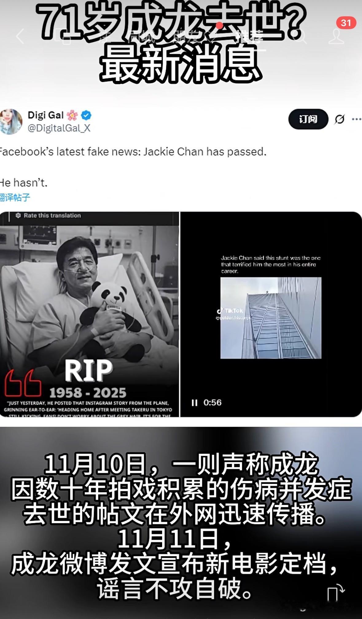 成龙10月10号因为积劳成疾…… 当名人,明星真不容易,几年被死一次,能活着也真是命大。成龙又被别人造谣,说是10号因为积劳成疾去世,11号微博更新,所有造谣不攻自破。 真不知道造谣人怎么想的,实际就是造谣要承担的后果太轻了,所以有些人没有底线的去博流量,刷存在感,恶意造谣,诋毁,诅咒他人。 成龙就是一个武戏演员,他的角色深入人心,是大家非常喜欢的一个艺术家,我们好好看他的电影,对于他的私生活,于我们无关。