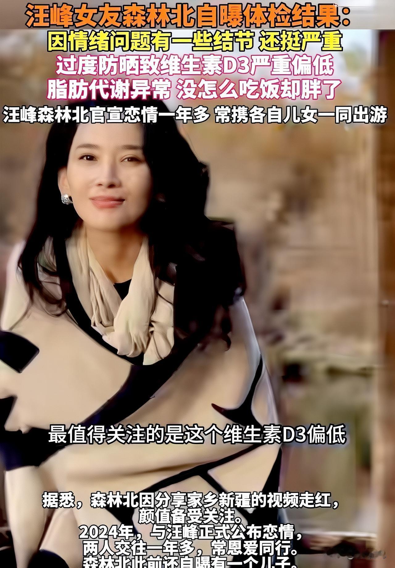 汪峰你听到了吗?森林北自曝脂肪代谢等体检异常,明显是说给你听的,章子怡、葛荟婕听了会不会偷着乐? 森林北自曝自己的身体:"没啥大病,就是小毛病一个接一个。" 而且表示最让她发愁的是情绪性结节,并表示,这半年来,身子骨确实没少给发警报。 情绪性结节,可是心理劳累引起的 想想森林北也不容易,自己俩孩子,加强汪峰4孩子,合起来每天为6孩子操劳 能不劳累吗? 也给森林北一点建议 先把觉睡好,别熬夜。睡够了,身体才能修复。 三餐规律,多吃点蔬菜水果,油腻的少碰。 动起来,出点汗。 不用多猛,每天散步半小时也行,让身体活络起来 心里别憋事。 情绪性结节就是累出来的。找朋友聊聊,或者培养个爱好。心里舒坦了,病就少一半。 记住,先照顾好自己, 你好了,才能照顾你在乎的人。 汪峰你也多关心点家人,希望你们夫妻能长长久久 汪峰女友森林北自曝体检结果