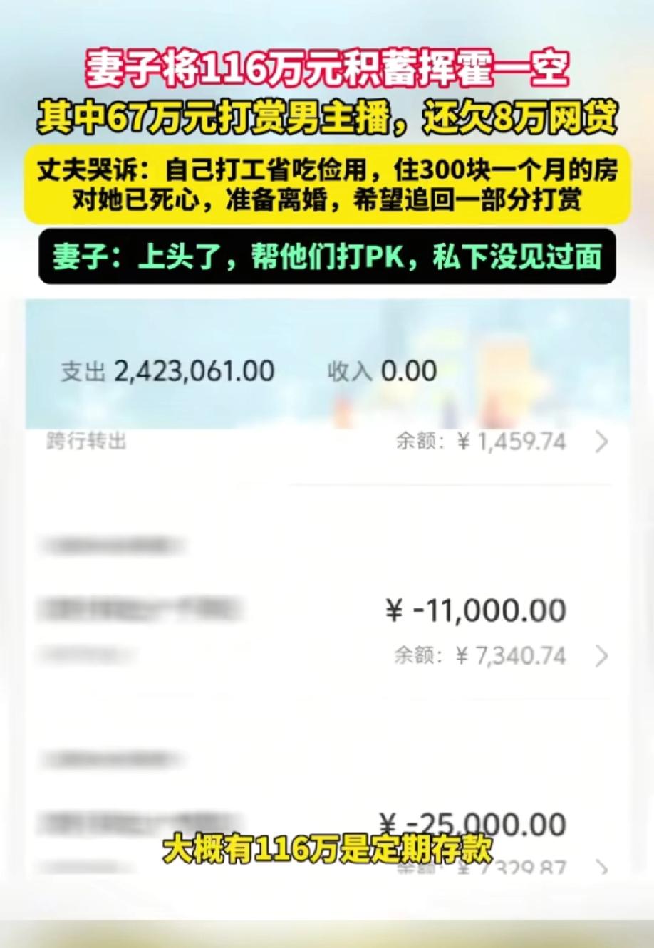这个女人有多败家 和丈夫结婚8年,把家里116万的存款全部挥霍一空,还负债8万。 在丈夫追问下,妻子才告知67万帮主播打Pk,剩下的钱花哪都不知道了。 丈夫是彻底寒了心,他没想到自己为了省吃俭用,租300元的房子,冬天漏风夏天漏雨,妻子住着暖气房,还把他挣的钱都给了别人。 丈夫能把所有的钱存在妻子名下,可见他对妻子的信任,没想到妻子却以这样的方式回报他,谁能接受的了。 丈夫希望先追回一部分打赏,然后再和妻子离婚。 也不怪丈夫生气,这样的女人有多少钱也不够花,谁受得了!