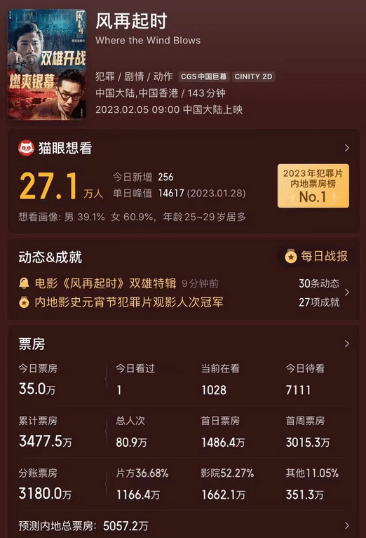 如果最终《风再起时》的总票房是5000万,意味着这部电影“全军覆没”,亏损超过2.3亿!