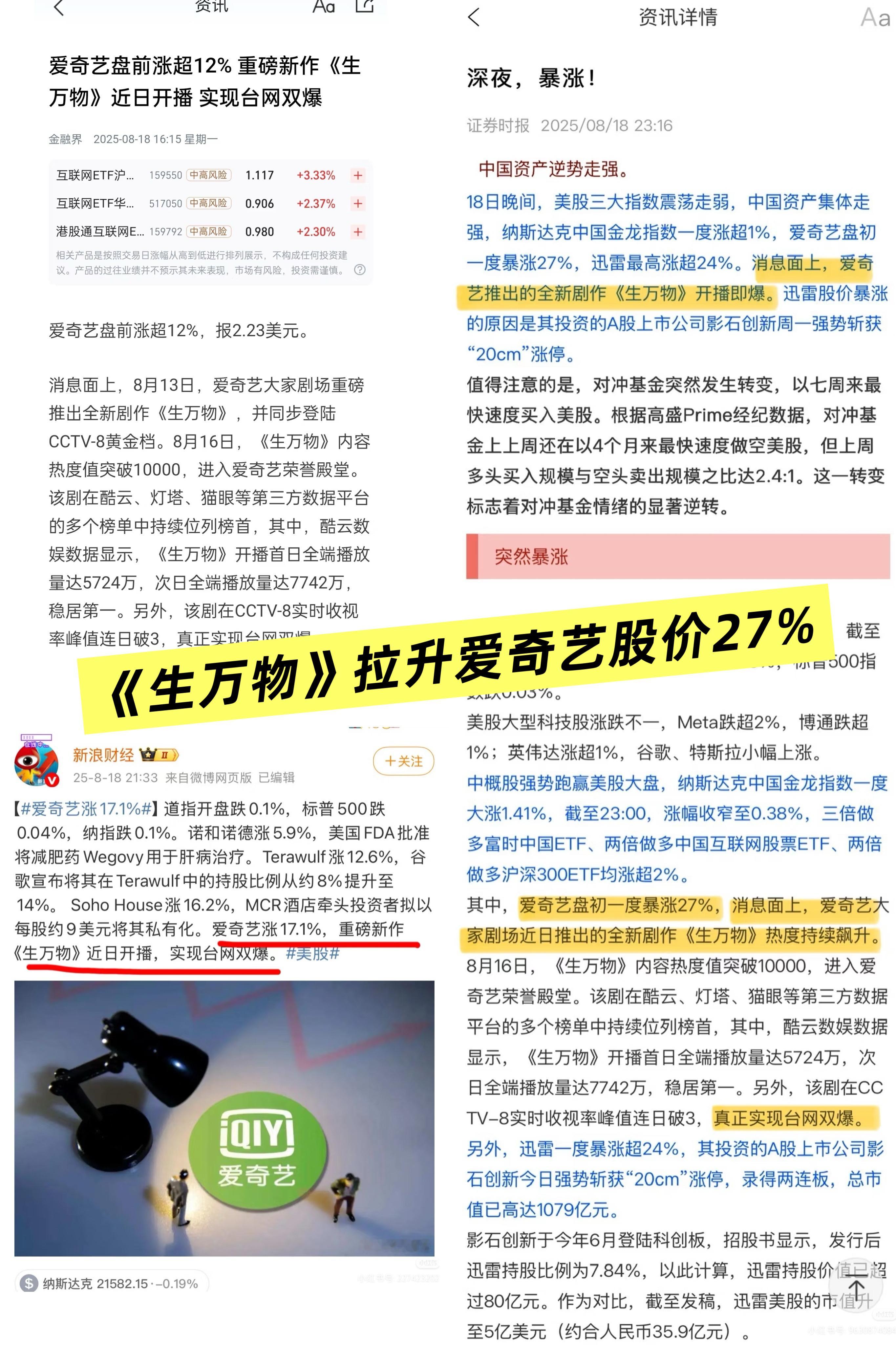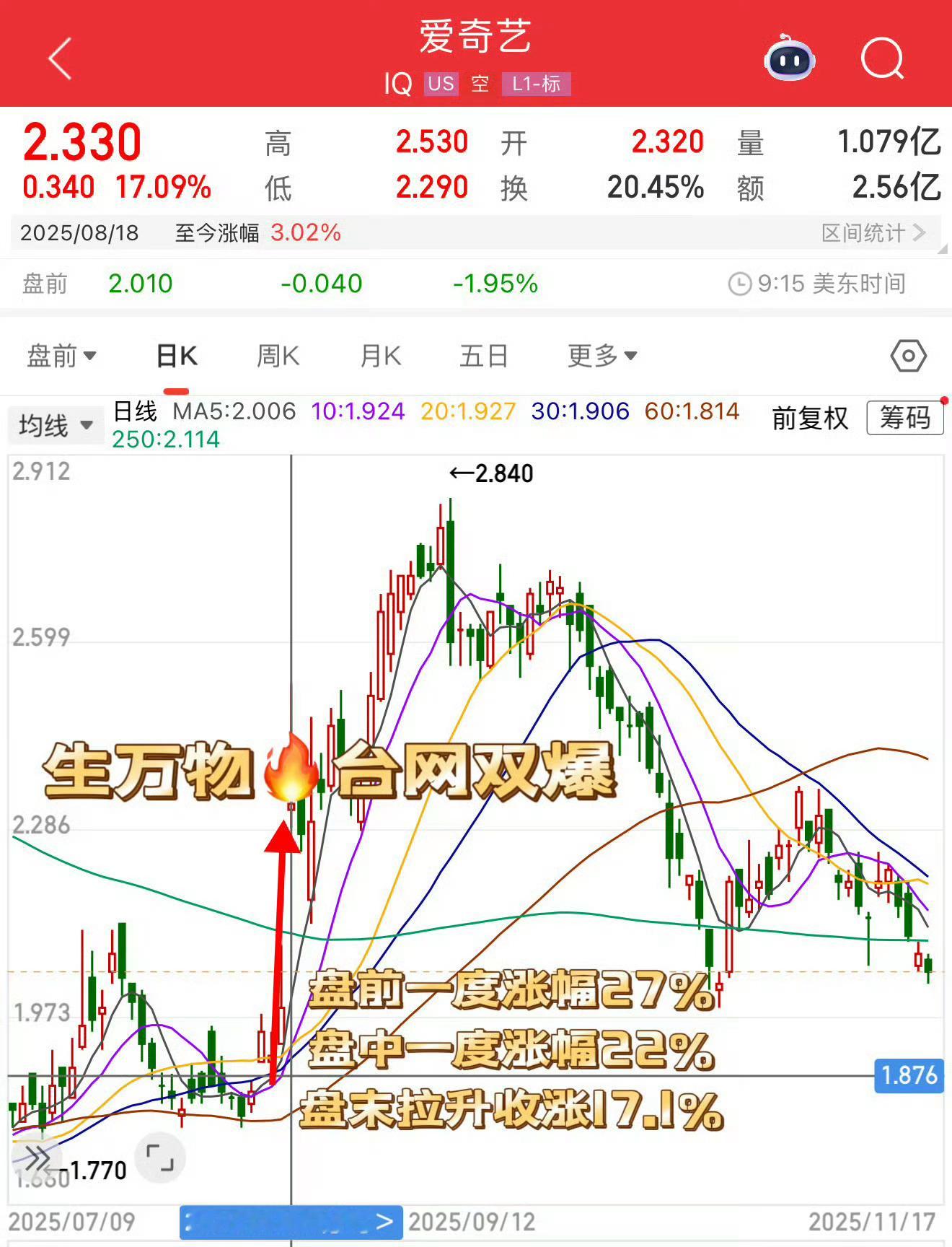 群里收到的前两张图,生万物直接拉升爱奇艺股价,一路飙红啊,这才是真牛