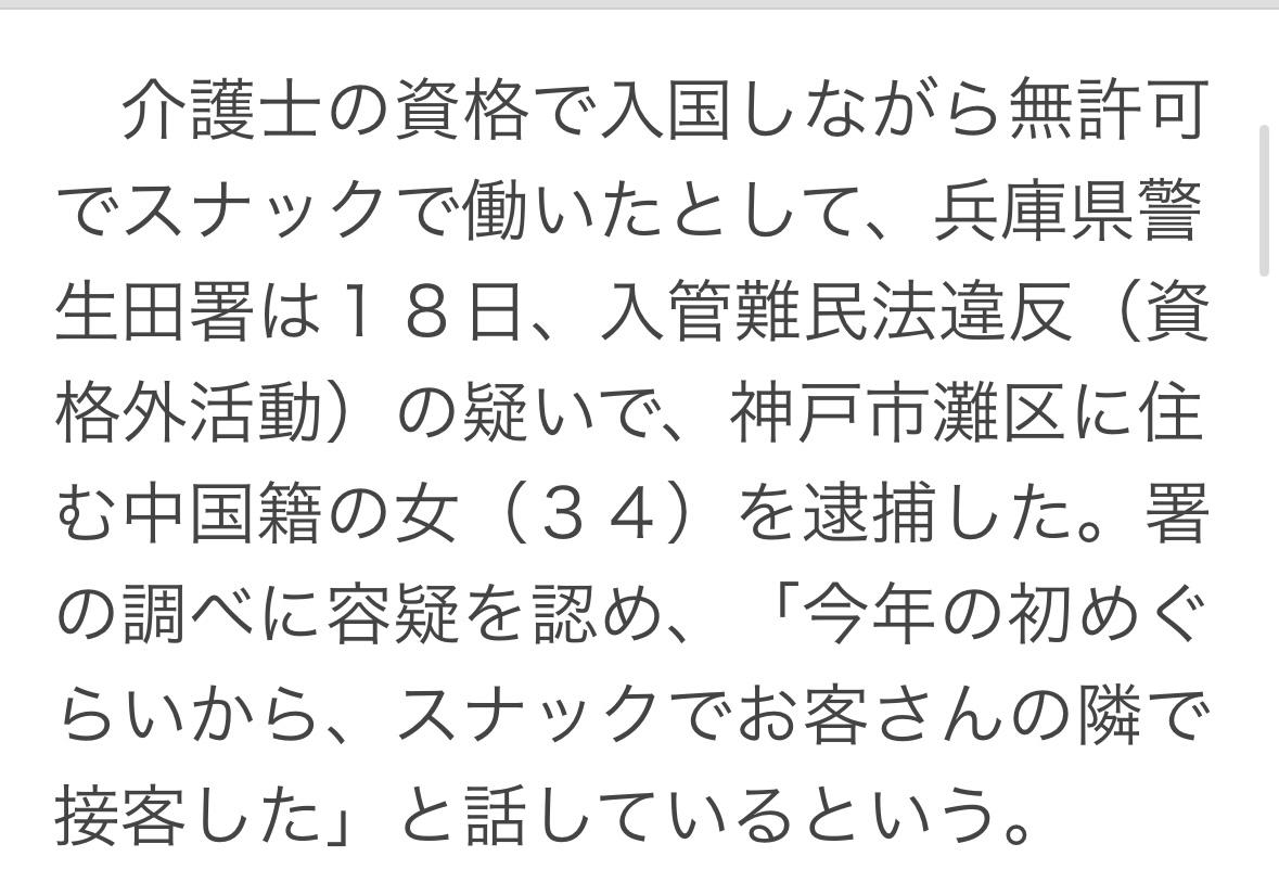 34岁中国女子持特定技能1号工签,赴神户做介护工作。 但是,该女子还有其它特长,擅长陪酒陪聊。 所以,从去年12月~今年10月就去夜店赚外快了。 或许运气不太好,已经被抓。涉嫌违反《出入境管理及难民管理法》。