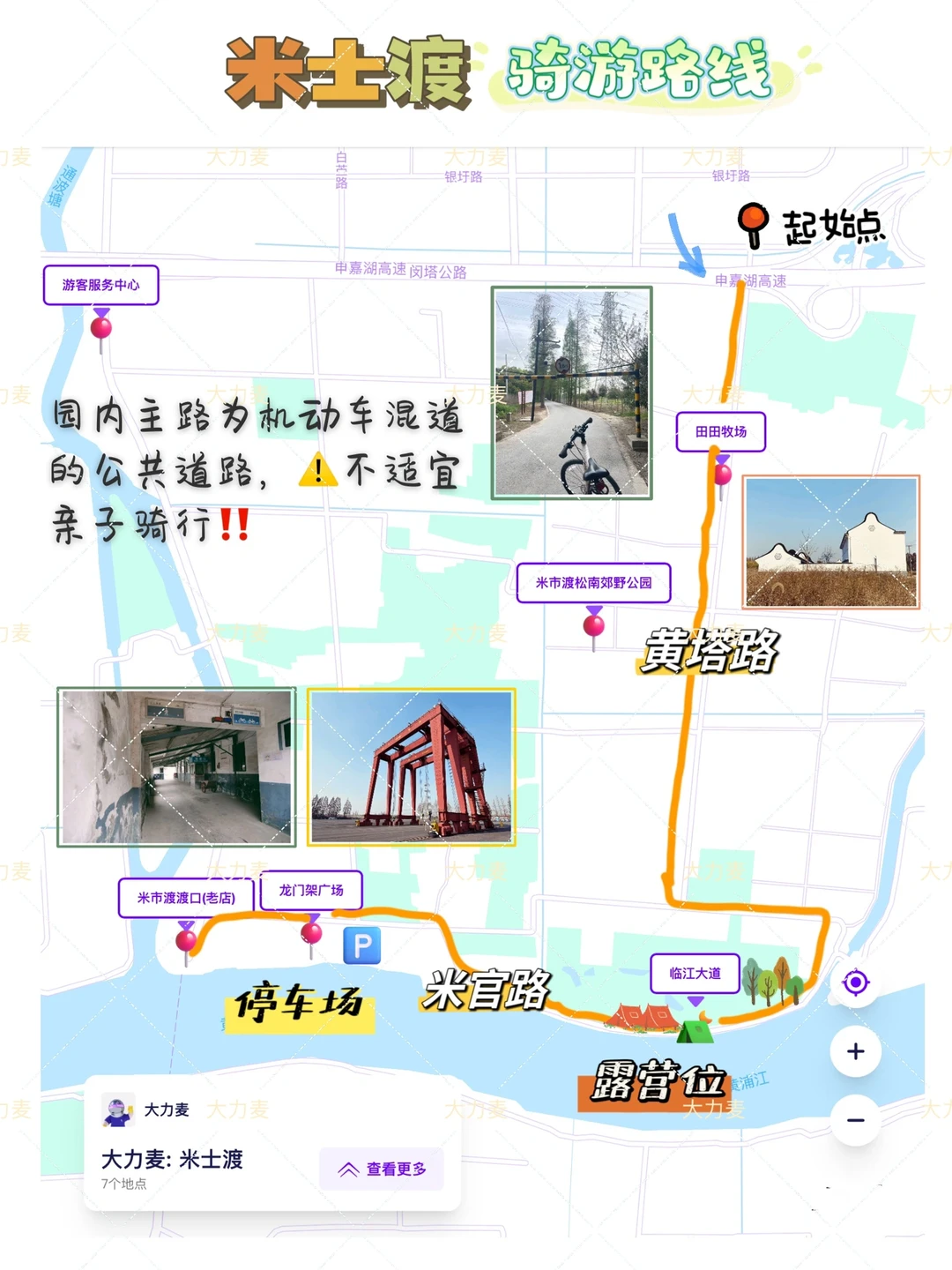 📍园内路线(图7地图):到米市渡的导航比较含糊,我骑车进入的入口是黄塔路&闵塔公路,沿黄塔路一路往南经过三个路口即可到临江大道(米官路)