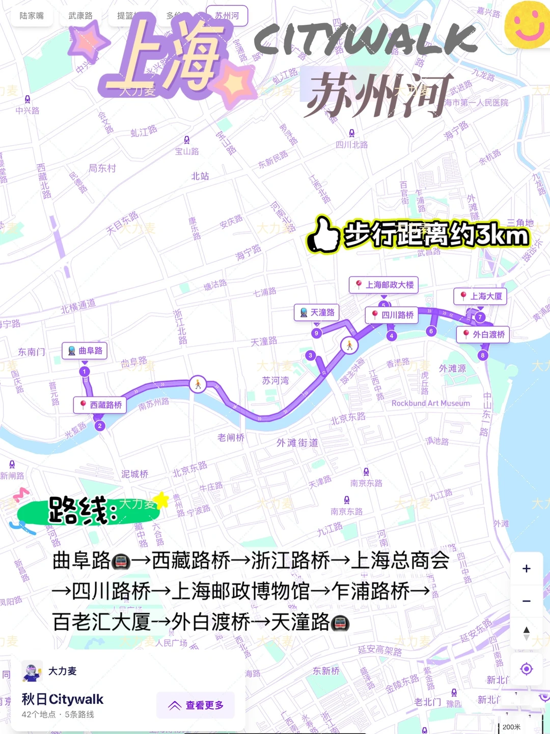 📍路线:曲阜路🚇→西藏路桥→浙江路桥→上海总商会→四川路桥→上海邮政大楼→乍浦路桥→上海大厦→外白渡桥→天潼路🚇