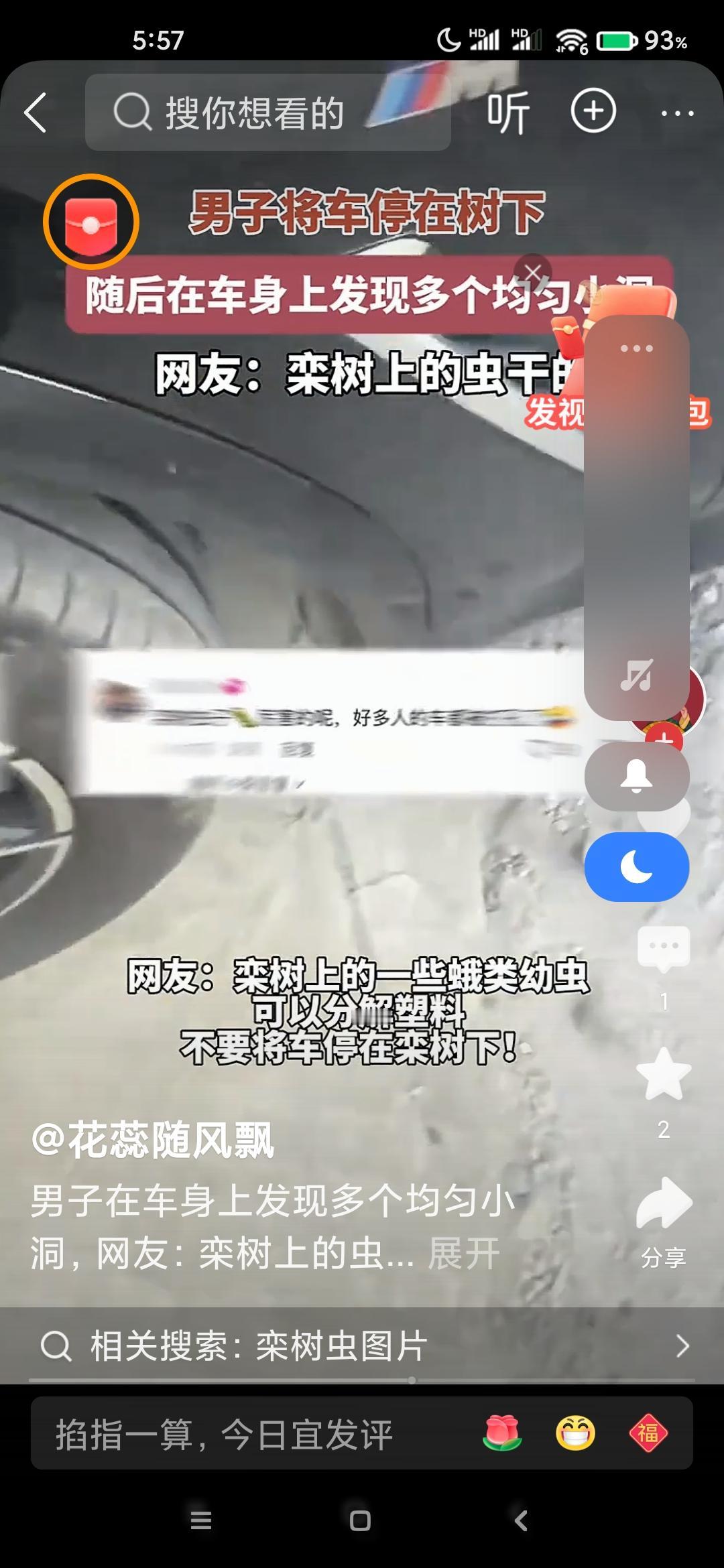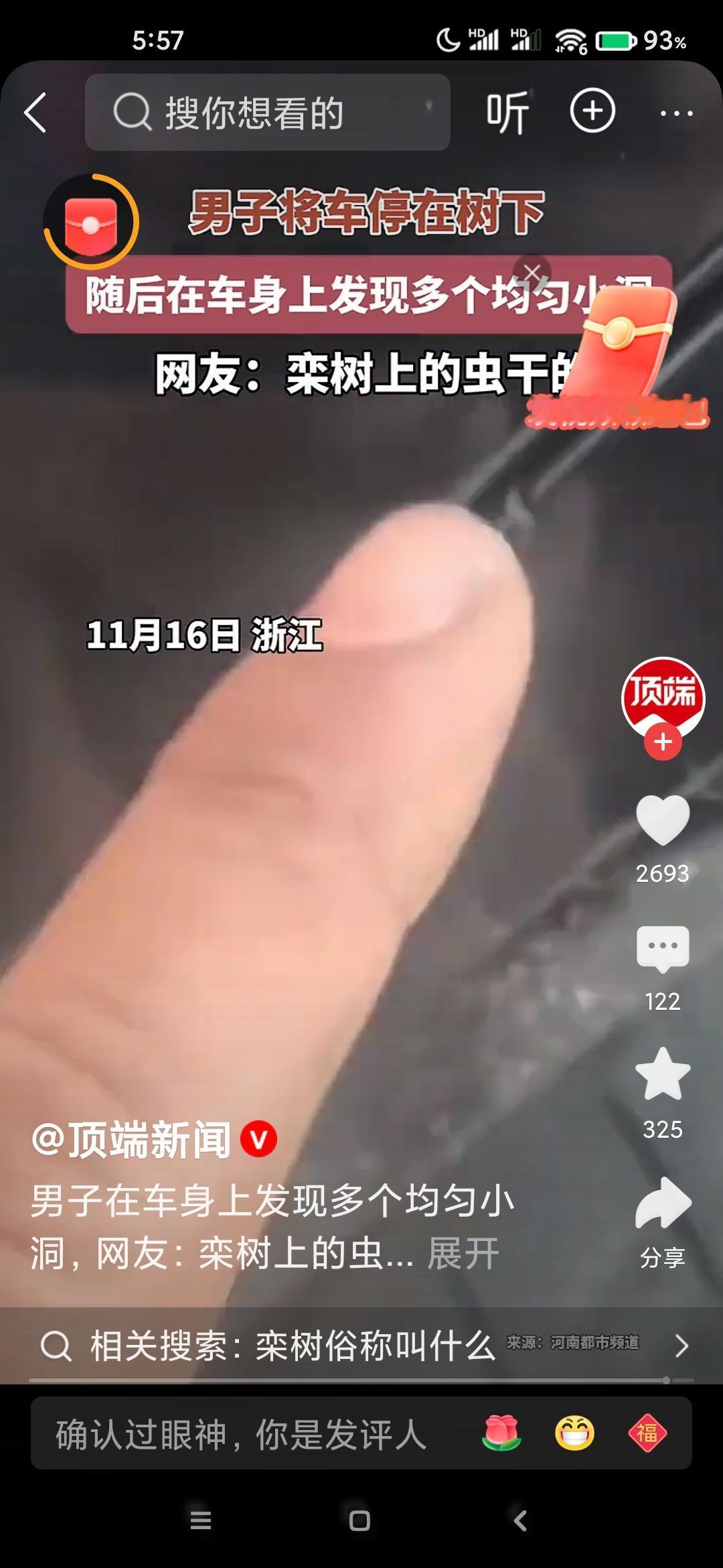 男子车停树下发现车身出现均匀小洞 浙江icon多地车主最近可太闹心了,新车变“虫啃车”。上周六嘉兴icon有车主刚提的新车,停在栾树下隔天车身就全是小洞,杭州icon、温州icon也有类似情况。 根据您的描述,浙江多地车主反映新车在树下停放后出现均匀的小洞,导致车辆受损。这种情况可能由以下几种原因引起: 昆虫或虫卵侵蚀:某些昆虫或虫卵可能在树下繁殖,幼虫或虫子在车身上啃食,形成小洞。这在某些地区的树木附近较为常见。 树脂或树液滴落:树上的树脂或树液可能在车身上形成硬块或腐蚀车漆,随着时间推移可能出现类似被啃蚀的痕迹。 化学腐蚀或污染:树叶、花粉或其他物质在车身上积累,加上空气中的污染物,可能导致漆面腐蚀,形成小洞。 其他环境因素:如鸟粪、树脂、虫害等共同作用,也可能导致车辆漆面受损。 建议措施: 及时清洗车辆:尤其是在树下停车后,应尽快清洗车身,去除树脂、虫卵等有害物质。 避免长时间停放在树下:如果条件允许,选择开阔、没有树木遮挡的停车位。 检查车辆损伤情况:如果发现车身有明显损伤,应及时到专业修理店进行检查和修补。 向相关部门反映:可以向物业或相关管理部门反映,了解是否有措施减少树下车辆受损的情况。 如果情况严重或反复发生,建议车主保存照片并与车辆保险公司联系,了解是否可以索赔或获得帮助。同时,也可以咨询专业的汽车维修人员,采取必要的保护措施,如使用车衣或防护蜡等,减少损害风险。新车刮痕 虫蛀车 虫子厉害