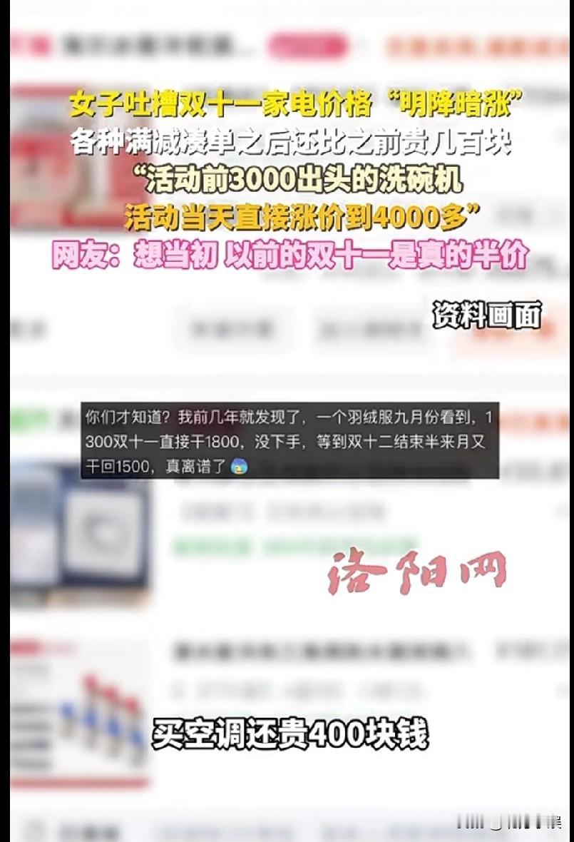 女子吐槽双十一家电价格“明降暗涨”,各种满减、减完优惠券后,比活动前还贵。 女