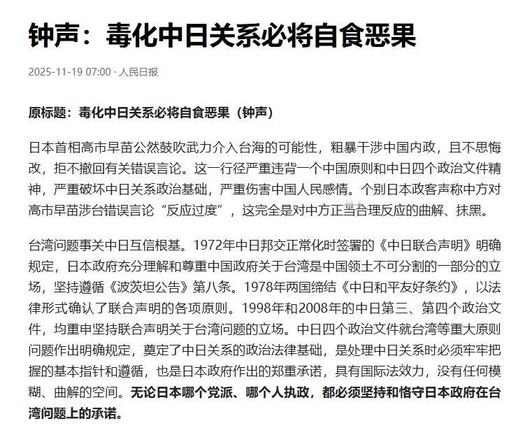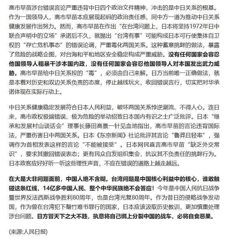 高市早苗政府一直强调她没有改变历届日本政府的立场,如果是真的那就说明日本政府内部对台湾问题还有一个绝密的立场,是高市早苗把这个立场公开化了,也是直接叫板中国更是提醒了中国。如果日本历届政府没有这一立场,就是高市早苗一个人在搞政治冒险。无论哪种情况,中国都必须反制日本,让她付出沉重的代价!如果真是日本历届政府立场,正好借机让日本政府全面纠正,一切都公开在面上;如果是高市早苗个人的问题,那就一下子彻底打消她的念头,甚至要把她赶下台去。
