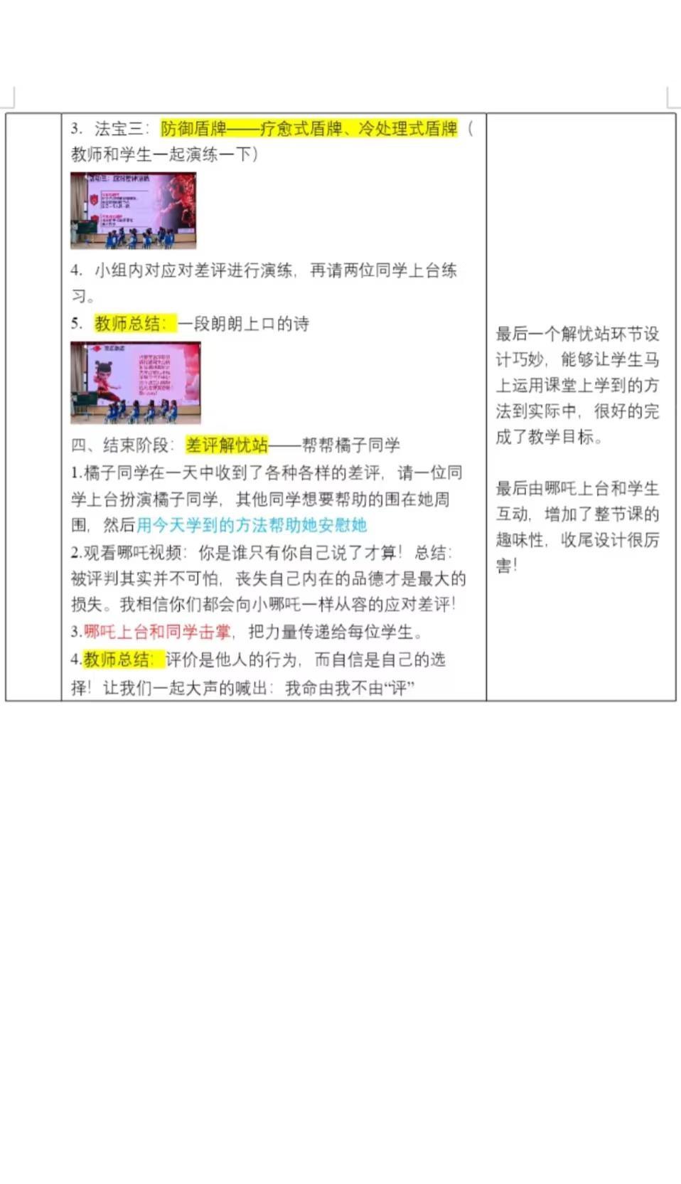 打卡一周一节优质心理课1️⃣ 主题:我命由我不由“评”—跟哪吒学习应对差评 学段:小学四年级 思考: [一]热身操导入能够迅速把学生带入到课堂情景中。 [二]由哪吒遇到差评的视频片段引出主题,可以降低学生的心理防御,引起学生的注意。 [三]讲解受评忧虑,将学生的模糊化感受具体化,知识化,可以让学生对这种难受的感觉有掌握感。 [四]先让学生讨论应对差评的方法,再教给学生另外的方法,重难点突出!每个法宝都有演练环节,可以帮助学生更好的理解掌握。 [五]最后一个解忧站环节设计巧妙,能够让学生马上运用课堂上学到的方法到实际中,很好的完成了教学目标。 最后由哪吒上台和学生互动,增加了整节课的趣味性,收尾设计很厉害!心理课 教学反思 优质公开课 情境化教学设计