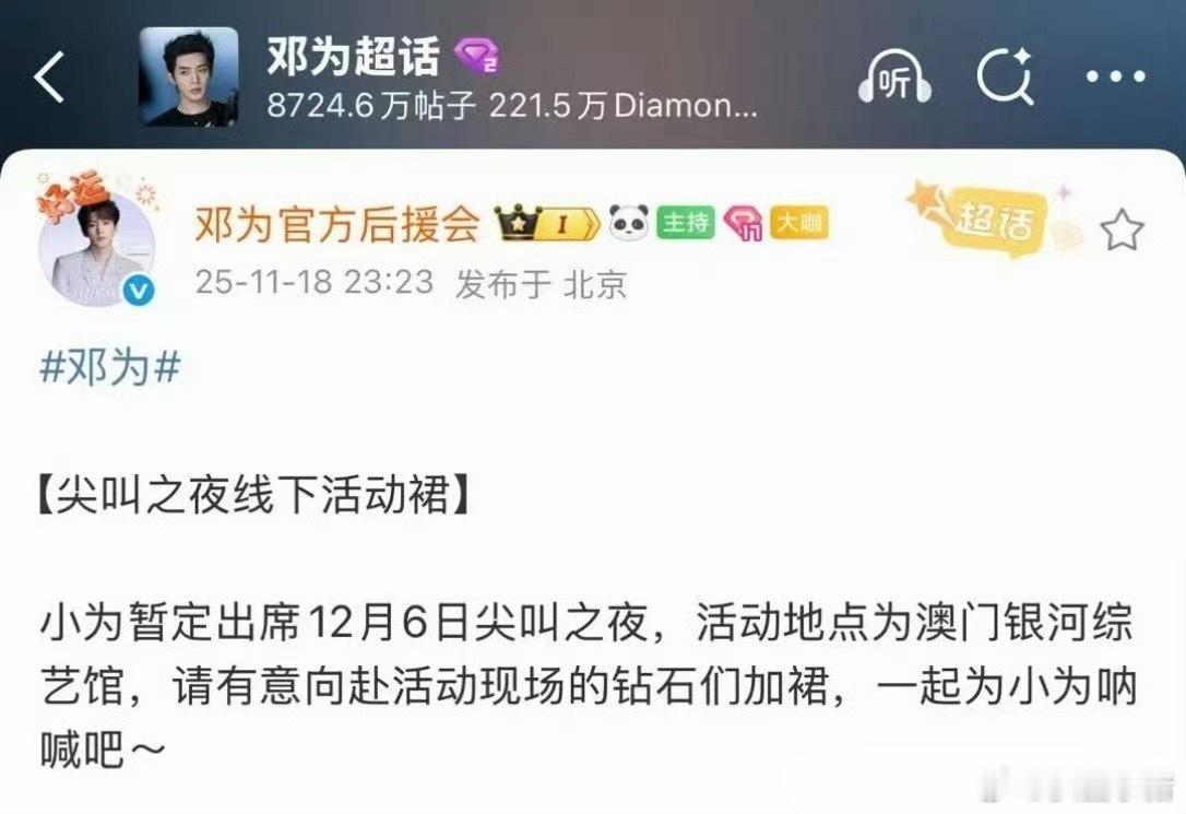 邓为确认出席12月6日的澳门尖叫之夜!!狠狠期待我们为子