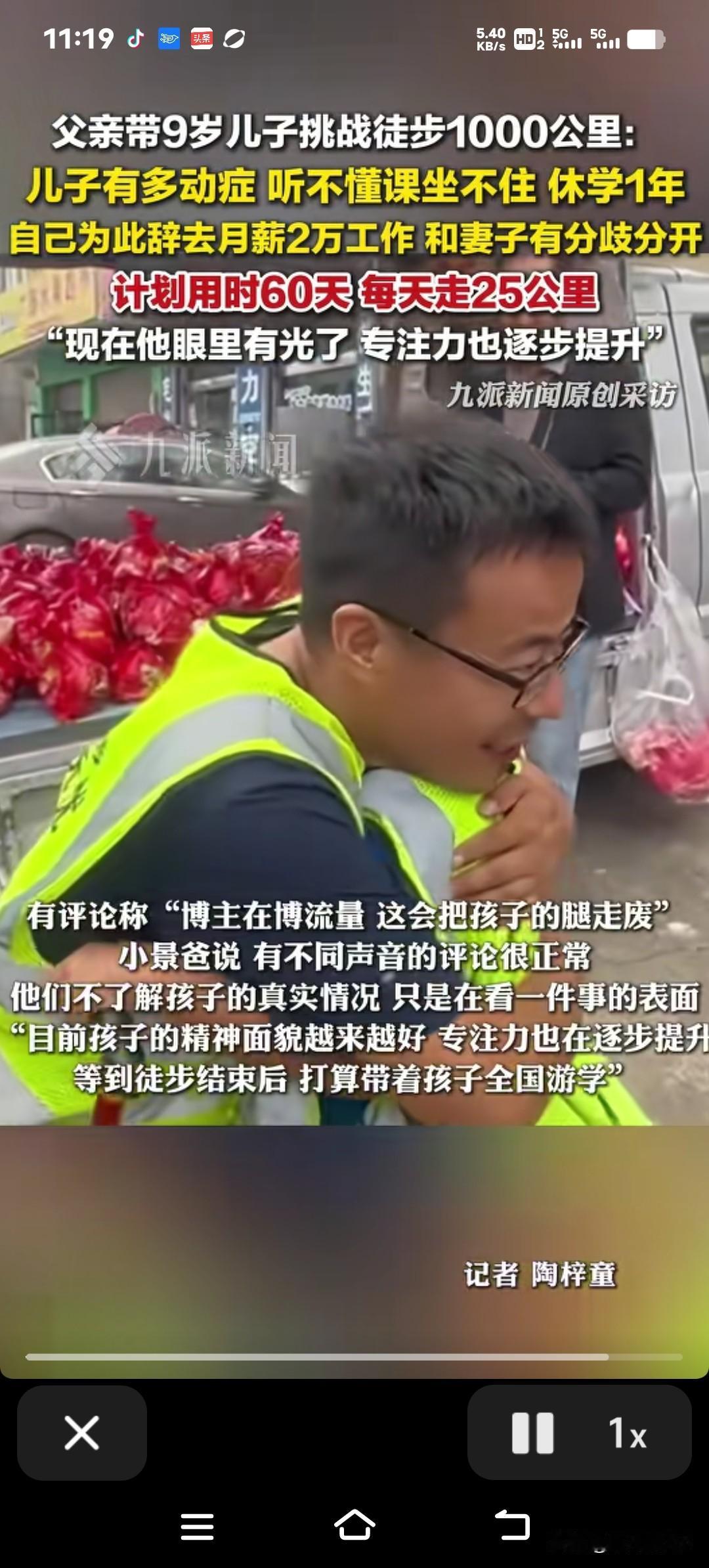9岁的小景从小就有多动症,在学校里因为注意力太分散,没少让老师头疼,后来干脆被劝退了。他的爸爸余先生看着孩子迷茫的样子,做了个决定——辞掉工作,陪他一起徒步1000公里,从湖南出发走到山东,就想让孩子找回专注力,也让他看看自己到底有多棒! 大概一个多月前,来自湖北的余先生,就带着9岁的儿子小景,从湖南的起点开始,一步一步徒步走了1000公里,最终到了山东。每天的行程也不轻松,少则走20公里,多则30公里,有一次甚至走了45公里才停下。好在路上还有另外两个家庭一起走,几个孩子凑到一块儿互相加油打气,倒也不觉得孤单。 走了这么久,小景不光比出发时长高了3厘米,眼睛里的光也亮多了,还特别骄傲地跟爸爸说:“我还想再走1000公里!”这场徒步对他来说,不光身体结实了不少,更让他心里有了底气——原来自己真的能做到这么厉害的事!余先生看在眼里,也跟小景说,以后还要带着他去全国游学,继续用走路的方式,一点点感受成长的力量。 虽然也有人觉得“这不是折腾孩子吗”,但每次看到小景脸上的笑容,就知道——这或许就是给孩子最好的成长礼物吧!