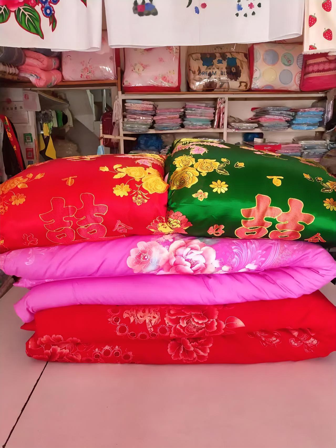 这是婚庆喜被 属于中式传统婚礼中的陪嫁床品 这喜被就是咱结婚常用的那种,红彤彤、花里胡哨的看着就喜庆! 红的绿的粉的凑一堆,上面“囍”字明晃晃的,还有大牡丹花,都是讨吉利——红的是热闹,“囍”是成双,牡丹是盼着日子富贵。 这东西不光是盖的被子,是结婚时女方陪嫁的“脸面”,棉絮塞得厚厚的,摸着软和,用着也暖和。 老辈儿讲究这被子得双数,缝的时候还得说吉利话,其实就是图个结婚的热闹劲儿,裹着这被子,新婚的喜气都裹在里头啦。 祝结婚的每对新人白头到老,喜结良缘!结婚陪嫁被子