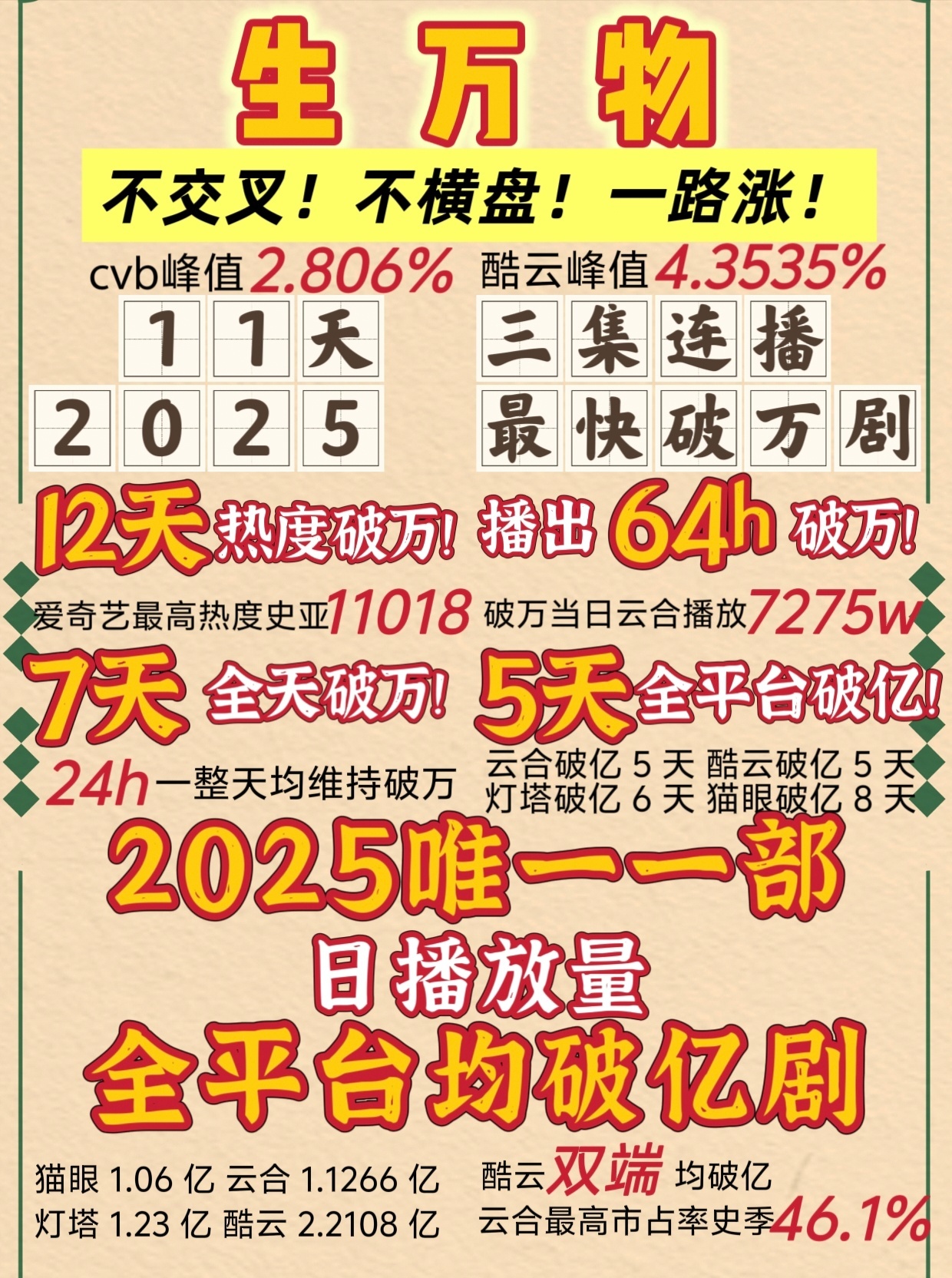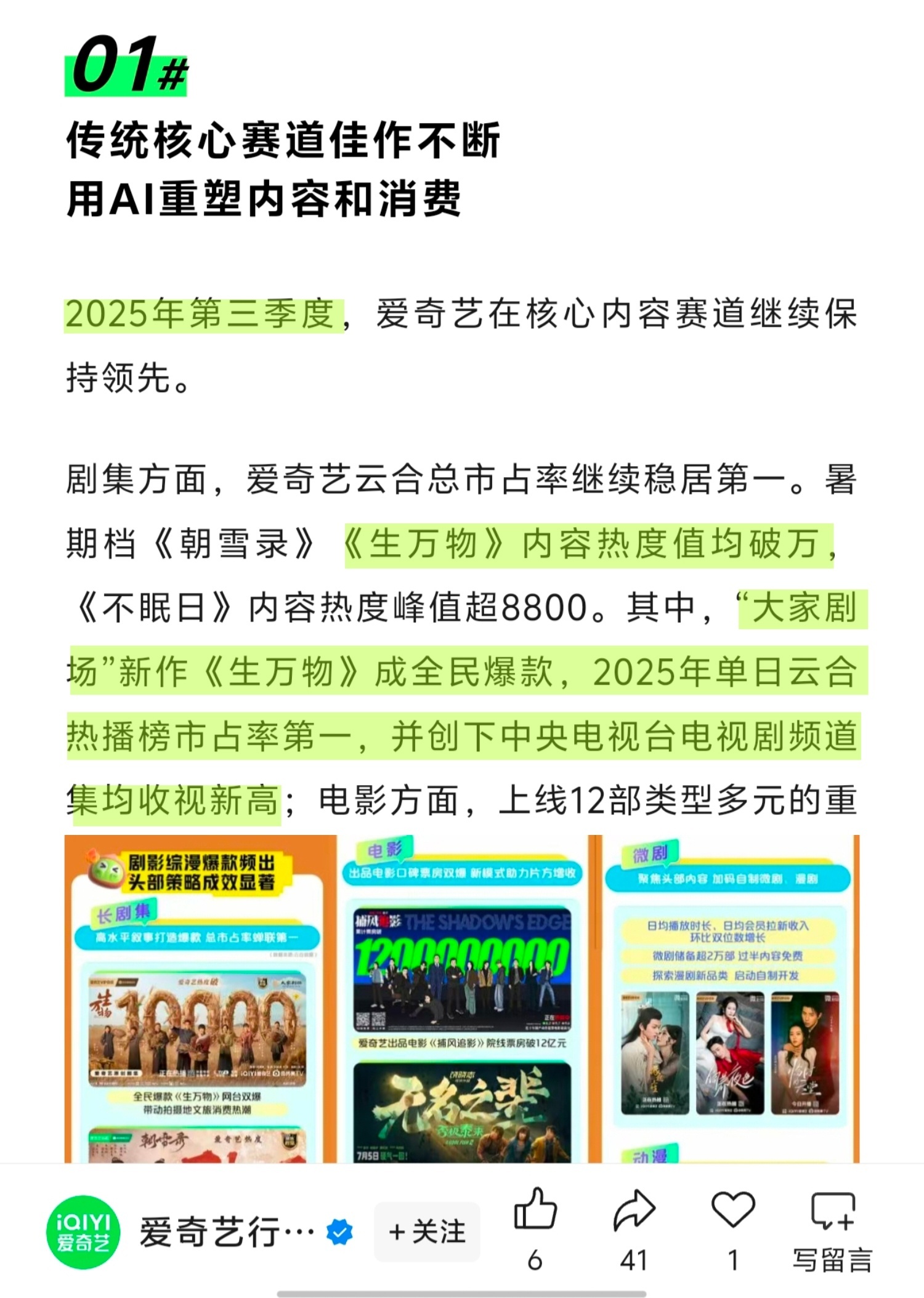 反正生万物是赚了,可以说2025年Q3生万物救了爱奇艺。爱奇艺Q3财报点明《生万物》热度破11018年冠史亚,单日云合市占率46.1%第一,央八集均收视新高峰值4.3535史冠。且《生万物》带动会员收入、带动品牌广告收入,拉升爱奇艺股价,实打实的经济收益哈。杨幂收视顶热度顶招商顶,样样顶尖🏆