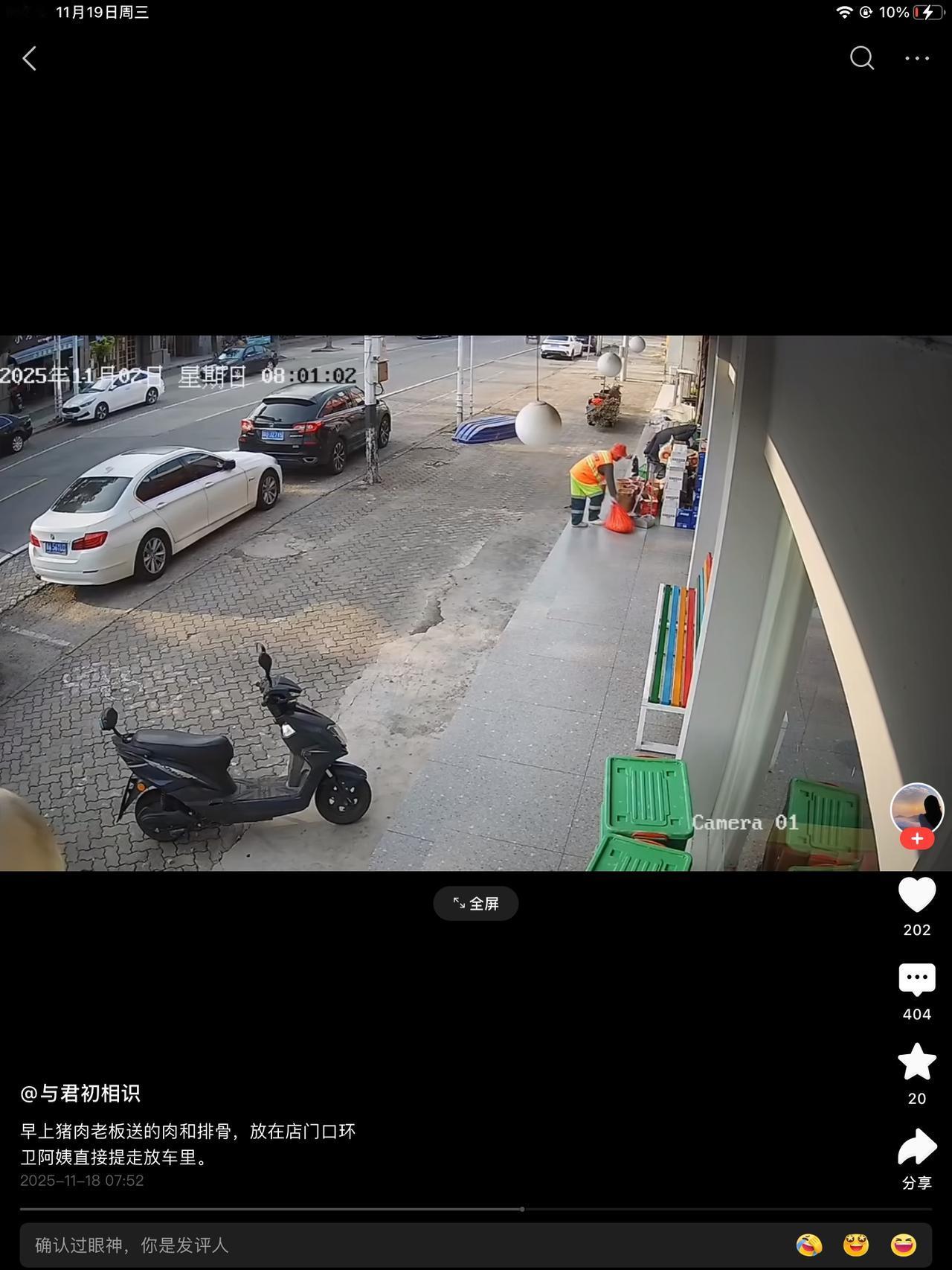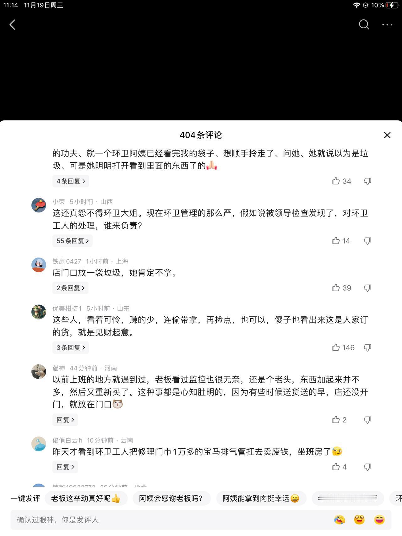 环卫拿走了饭店门口早上送来的肉和排骨。 别犟了,根本就是坏人变老了。又傻又穷又恶心。说放在门口碍事的,睁开眼睛看看,门口还有其他东西,就只有肉是碍事的?真知道即使找到她,也不能拿她怎么样,顶多就是还回来而已。 现在到处都是监控,她能不知道?我农村的爹都知道。我楼下的捡垃圾的大爷,人家只守着垃圾桶。你让他去你门口拿,人家都不要。他说,我够生活了。 铁扇说的对,你放袋子垃圾,她保证不拿。就是惩治太轻了。无语死了。