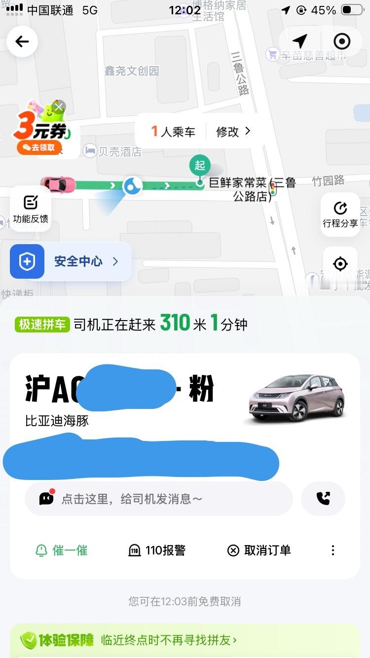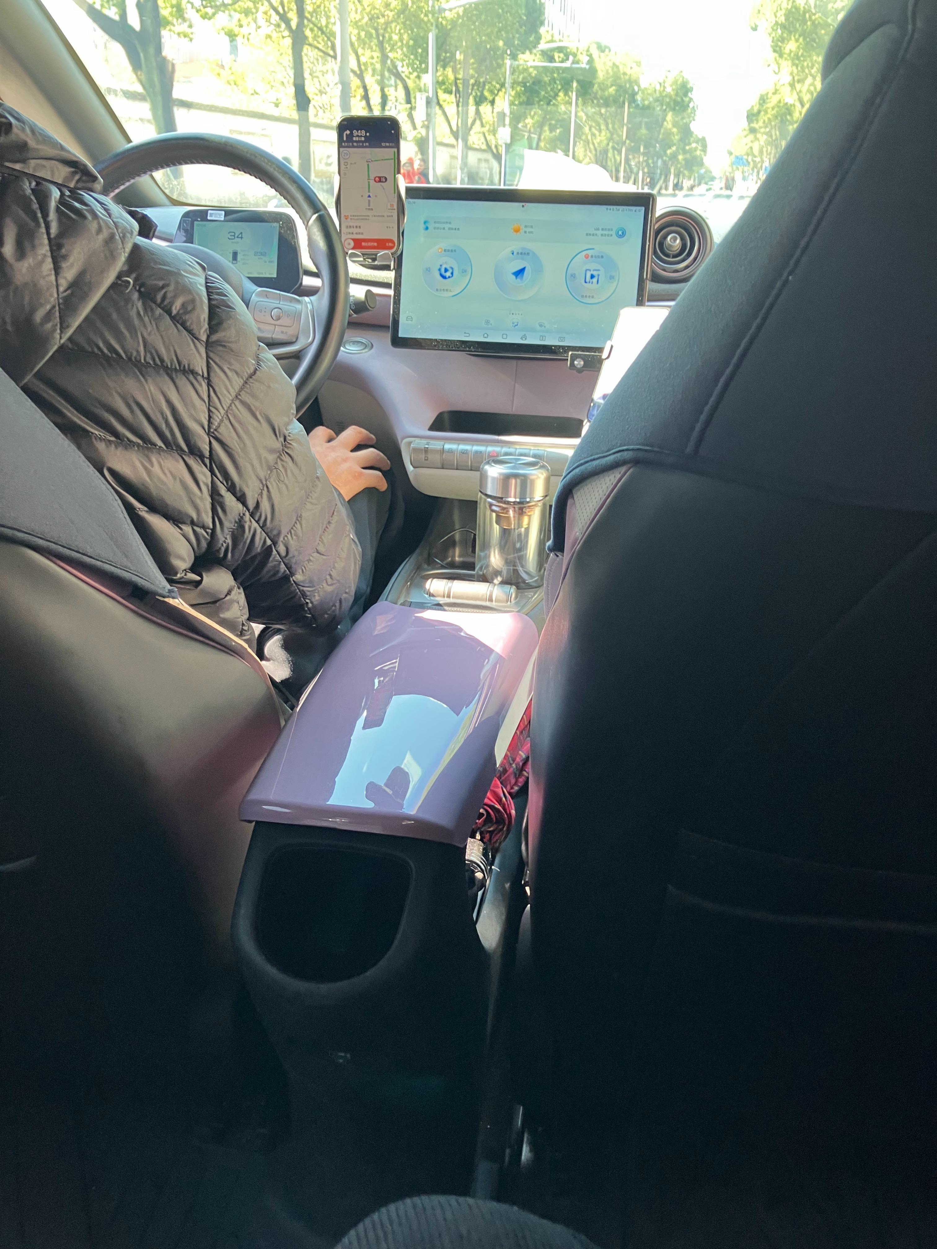 打到一台海豚,这是第一次坐海豚,从外面看感觉这个车很小,但是坐进去之后,这车空间真心可以。前面座椅正常,我后排还可以翘二郎腿。师傅跟我说这个车轴距2.7米,夏天能跑350,冬天能跑280!这车是真不错!