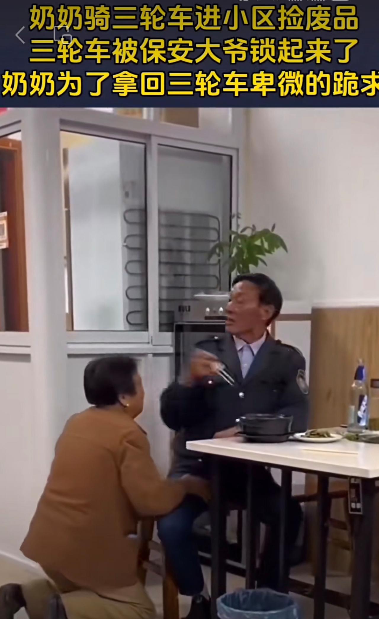 奶奶骑三轮车进小区捡废品 三轮车被保安大爷锁起来了 奶奶为了拿回三轮车卑微的跪求