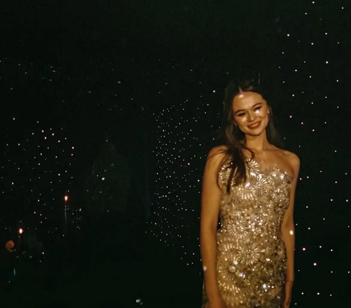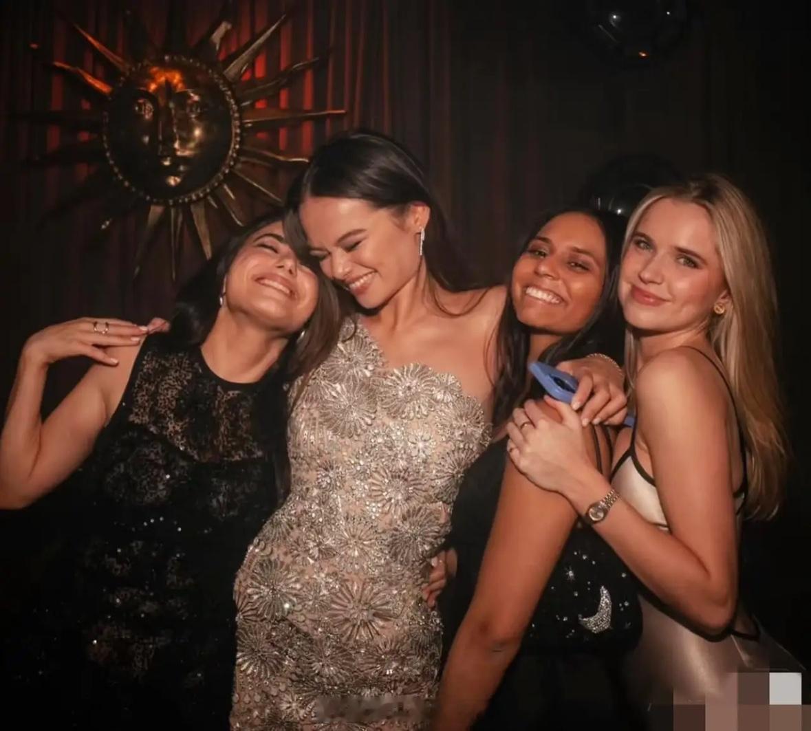 邓文迪大女儿格蕾丝和朋友庆生,庆祝自己的24岁生日,穿着一袭银色单肩长裙,长发披