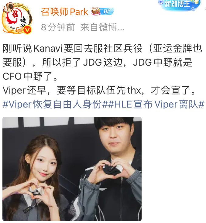 召唤师Park爆料:Kanavi要服社区兵役所以把JDG拒绝了JDG中野就是CFO刚thankyou的中野
