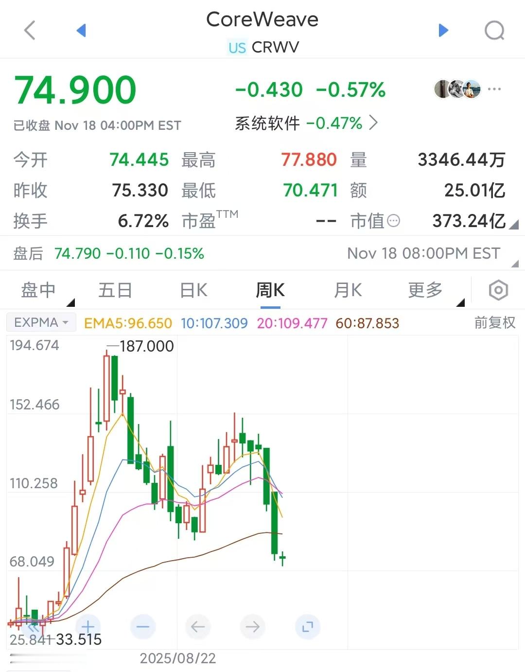 了解下英伟达相关的CoreWeave商业模式的泡沫破灭2025年3月,CoreWeave上市,暴涨到187,现在跌到了75。跌了60%算是泡沫破灭,但市值仍然有373亿美元。来看看这个AI股的泡沫程度有多高。英伟达本身的营收万众瞩目,预期订单多,营收高增长,市值大增有业绩支撑。但这并不是说AI泡沫就没有问题,AI产业链上不可能只是一家公司独大,这既不可能也不健康。需要看整个产业链,有没有大问题。英伟达的“亲儿子”CoreWeave问题就不小。CoreWeave是专搞AI基础设施的"新云"(neocloud)服务商,商业模式有点吓人, 借债买卡+出租算力+借更多债,号称是能持续增长的飞轮模式 。它的概念是IaaS(基础设施即服务),按小时出租GPU算力,按时间和计算量收费。CoreWeave先囤积算力,大规模采购英伟达H100、A100等算力卡,成为全球最大GPU持有者之一。截至2025年8月,CoreWeave持有超过25万个英伟达GPU,在全球有33个数据中心。从加密货币挖矿转型后,其GPU持有量从早期的小规模迅速扩张至25万级别,GPU资产约占公司总资产的50%做大的过程是杠杆扩张,靠借钱。用GPU资产和未来客户合同抵押,从金融机构获取巨额债务融资,再投入采购更多芯片。而机构愿意借钱,是因为大客户绑定,它与OpenAI、Meta、微软、英伟达等AI巨头签订长期大额合同,号称当前订单积压达556亿美元。(OpenAI与多家公司签订的长期合同,CoreWeave早就干了)大公司与金融机构愿意支持,因为CoreWeave的定位与AWS、Azure等传统云服务商不同,专搞AI,更专业地提供高性能、可扩展的GPU集群。客户如果自己建GPU集群,会需要巨额的资本支出(Capex),钱花掉了变机器;租CoreWeave的算力,就是小得多的运营支出(Opex),不对劲也能控制支出,停租就行了。AI预期火爆的时候,CoreWeave股价迅速崛起。但由于商业模式存在结构性风险,泡沫已经开始破灭,股价大跌60%都不是“不健康”的问题了。其2024年营收19.15亿美元,但为了实现这个服务营收,亏损高达8.63亿美元,先期投入不小。微软和英伟达两大客户占收入77%过于集中,其余市场化收入仅4.4亿美元,大硬伤是基础商业模式无法覆盖成本。英伟达本身既是股东又是客户,给了13亿美元合同,这种依赖关系不稳定。一旦大客户需求下降,或者转向自建设施,其收入立即崩塌。如果不看GPU资产,CoreWeave总债务150亿美元,账面现金仅10亿美元,杠杆率过高。因此,GPU是核心抵押物,但GPU以极快速度贬值,现在的主力资产H100,在三年后可能无人问津,能值多少钱成问题。一个没法回答的质疑是,GPU资产贬值,而债务却不变,现金流压力如何应对?实际收入几个亿,搞到800亿美元估值完全是AI狂热气氛下的疯炒。狂热的时候,是说“当前订单积压高达556亿美元”,但现在回头看,和OpenAI对甲骨文吹的5000亿美元一样,主要来自少数大客户的"故事性"签约。一段时间以来,美股炒AI风气很不好,不太严肃的意向性合同,随时取消的,也当成商业合同来说。一旦GPU租赁需求急剧萎缩,CoreWeave的"飞轮模式"一下就会完蛋。它是债务驱动的GPU囤积,严重情况下等于大春囤积BB机。好的模式,需要是可持续的云计算服务,多种需求,客户需要长期化、多元化、分散化,只搞AI算力赌太狠。CoreWeave关键转折可能是,"英伟达GPU永远紧缺"的假设不成立。它缺乏扩展新客户的能力和技术护城河。当GPU供应正常化、AI计算需求稳定时,CoreWeave的高负债会很要命,资产贬值、收入锐减,双重暴击股价会跌没了。现在只是开始降温了,跌了60%还是很泡沫。