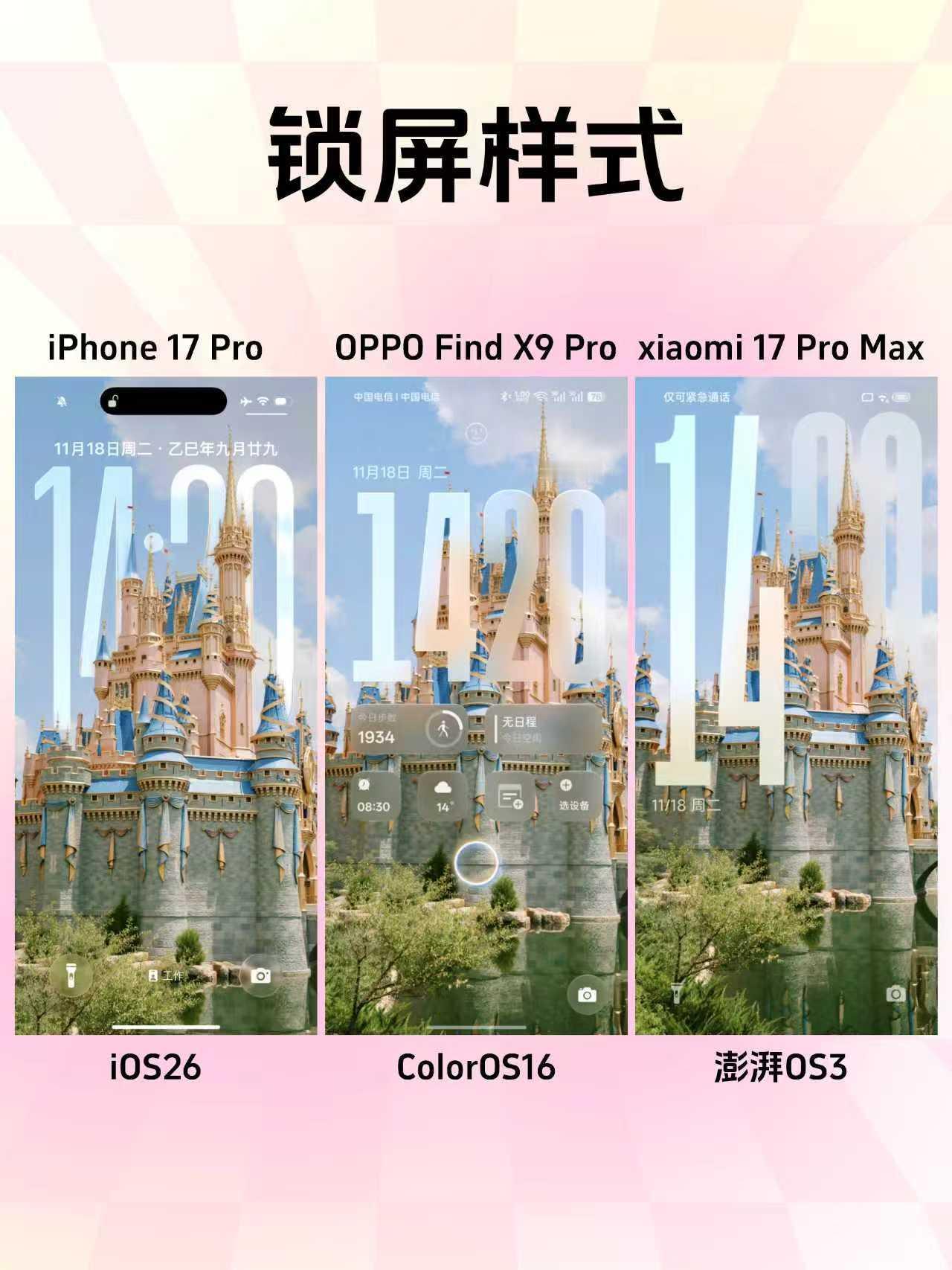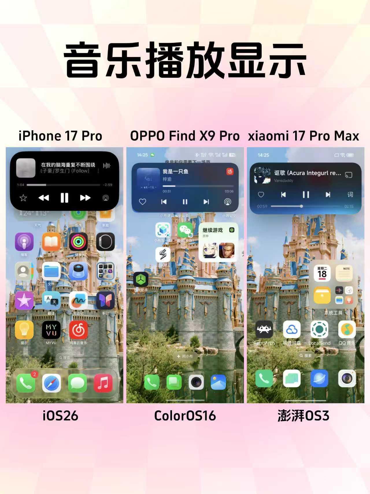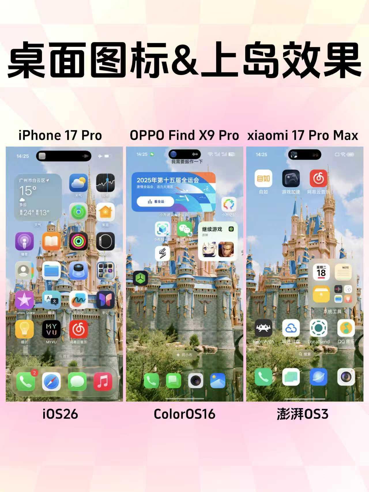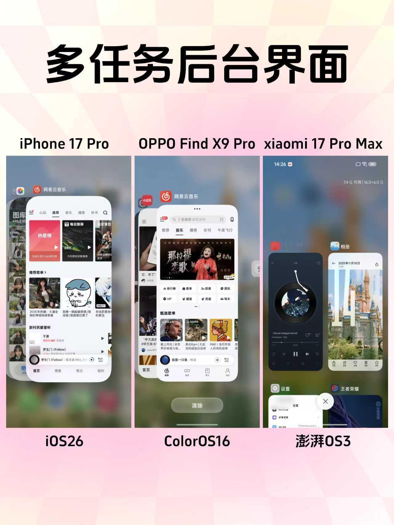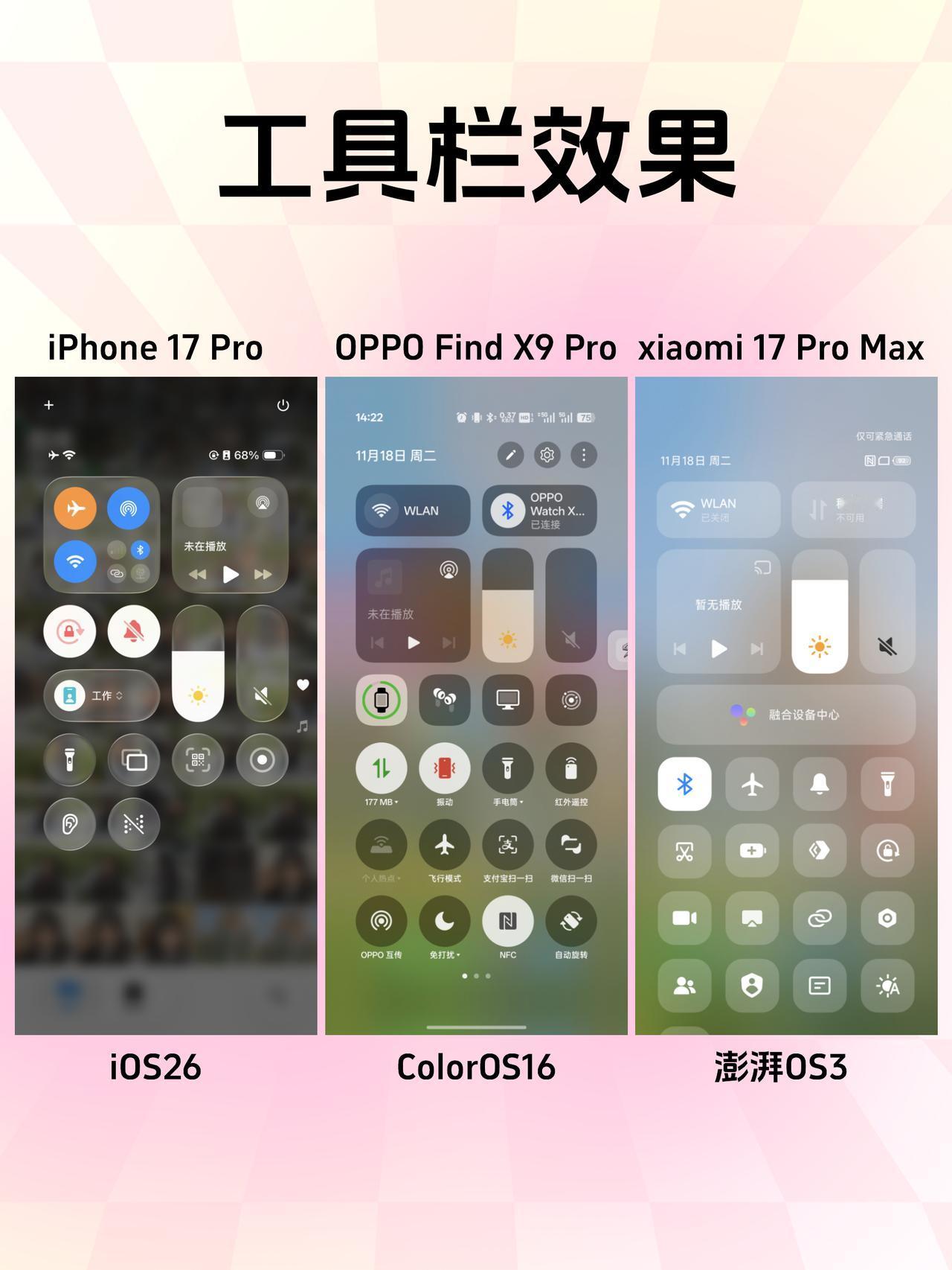 人气系统UI设计,你好哪口? 👀看了下三台热门旗舰的系统界面截图, 工具栏、多任务、锁屏、桌面……风格都很不一样, 但有一点可以先说:三家的流畅度现在都很稳✨。 📱iPhone 17 Pro|iOS 26: iOS 26的液态玻璃,又一次引领风潮了 不过比较挑壁纸,用户评价褒贬不一 下拉工具栏还有半透视效果 而且它的壁纸还带有裸眼3D效果,给足新鲜感 说实话,要论“系统精致感”,苹果还是有点东西的👍。 📱OPPO Find X9 Pro|ColorOS 16 机圈德芙再升级,不止流畅,动效也巧思多多 安卓阵营它说第二,应该没人敢说第一 更惊喜的是AI功能快人一步,流体云能提醒你快递、航班信息 锁屏还能语音转文字记笔记 堆叠式后台设计跟苹果巨像,果粉可以“无痛”换机 实用又漂亮👏 📱Xiaomi 17 Pro Max|澎湃OS 3 信息密密麻麻,怎么看都是“时间管理大师” 这版本流畅度和稳定性都没啥可太挑剔的了 工具栏排满;后台多任务依旧是小米典型的卡片式 超级岛设计,支持三个应用同时上岛 排列设计有想法,下拉还能变多窗😎 u1s1,现在三家系统都很流畅,但如果论设计成熟度+使用体验的综合分: iOS依旧天花板存在,而安卓这边蕞能和它正面比的,🎉个人认为就是ColorOS 16了~ 手机系统对比 OPPOFindX9Pro iPhone17Pro 小米17ProMax ColorOS16 iOS26 澎湃 OS3
