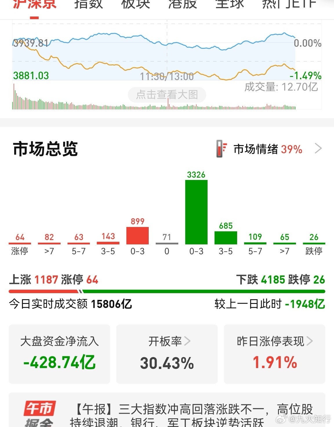 市场情绪还是比较弱,只有39分,跌停26家。今天就这样了,等晚上美股红了,明天再买。晚上美股绿了,A股明天也不好,哪怕指数红了,个股也会一般般。美股红了,个股至少涨跌参半,还有汤喝。