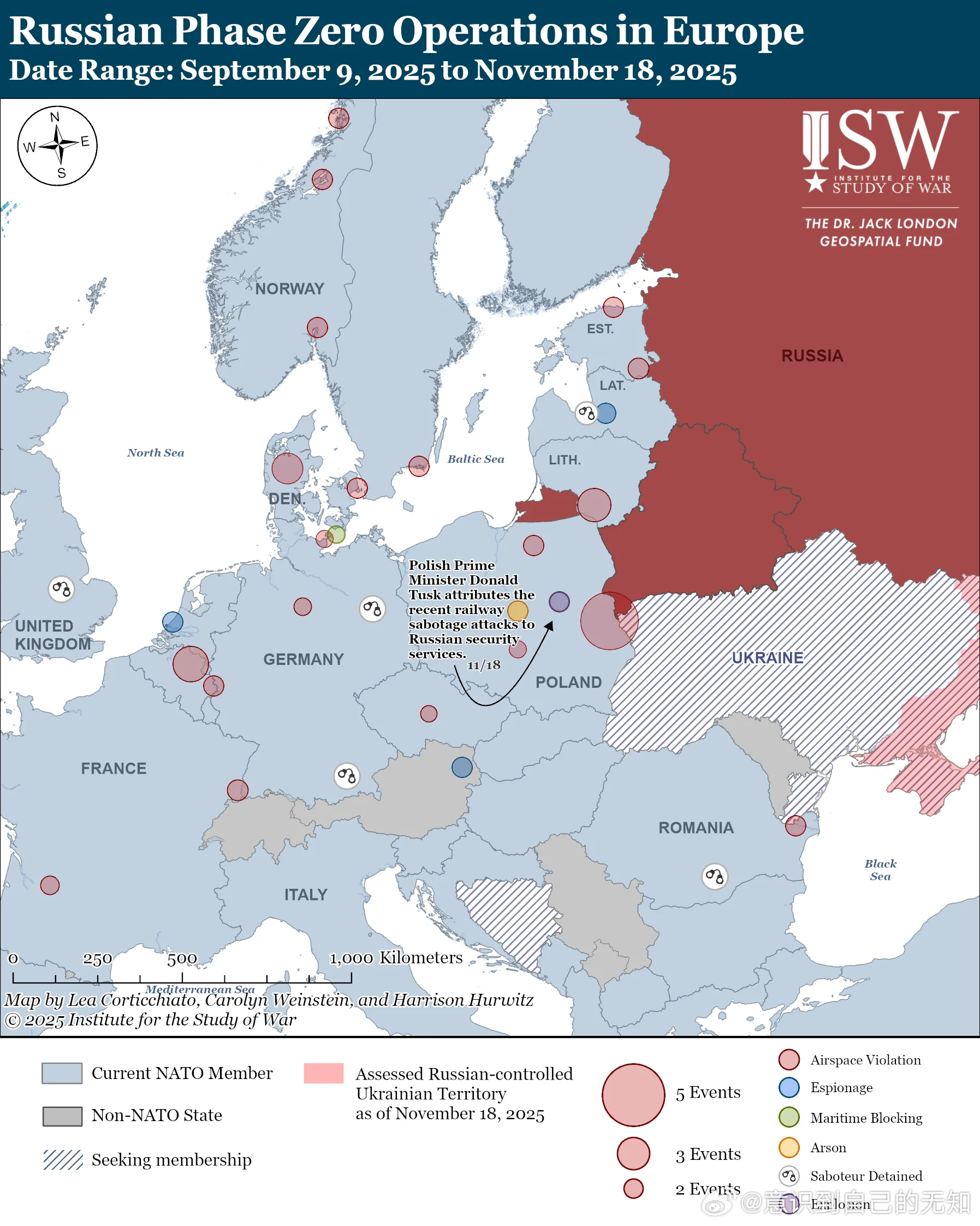 波兰官员将近期针对波兰铁路的破坏袭击归咎于俄罗斯安全部门。波兰总理唐纳德·图斯克于11月18日表示,俄罗斯特勤部门招募了两名乌克兰公民,他们于11月16日使用爆炸物破坏了卢布林至华沙铁路在米卡和卢布林附近的两个路段。波兰特勤部门发言人雅采克·多布尔任斯基表示,“一切”都表明俄罗斯特勤部门策划了此次破坏袭击。图斯克称,嫌疑破坏分子于2025年秋季从白俄罗斯进入波兰,并在袭击发生后返回白俄罗斯。波兰国防部长兼副总理瓦迪斯瓦夫·科西尼亚克-卡梅什于11月18日表示,这些破坏袭击是俄罗斯“摧毁共同体、破坏联盟、散播不确定性”的更广泛行动的一部分。波兰总参谋长维斯瓦夫·库库拉也于11月17日表示,波兰正处于“战前状态”,俄罗斯正在为“对波兰领土的潜在侵略”创造有利条件。这些波兰官方声明与ISW的持续评估相一致,即俄罗斯正在加强其“零阶段”行动,以破坏欧洲稳定,削弱北约的凝聚力,并为未来俄罗斯可能对北约发动的战争创造政治、信息和心理条件。