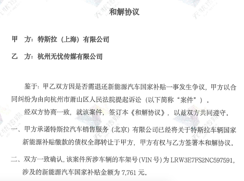 【:与7761元购车补贴有关,双方已和解】红星资本局11月19日消息 近日,“特斯拉起诉无忧传媒”的消息引发关注。今日,无忧传媒方面回应红星资本局称,此次纠纷与购车补贴政策有关,目前双方已达成和解,特斯拉也提交了撤诉申请。天眼查APP显示,特斯拉(上海)有限公司起诉杭州无忧传媒有限公司一案,将于11月24日在杭州市萧山区人民法院开庭审理,案由是合同纠纷。11月19日,无忧传媒对红星资本局表示,此次纠纷是公司在购车时因享受补贴政策未能按约定完成行驶里程数造成的违约。红星资本局了解到,2022年,无忧传媒购入一辆特斯拉,特斯拉垫付了7761元新能源补贴款,要求车辆两年内行驶里程达到2万公里;此后车辆里程未达到,特斯拉拿不到国家补贴,所以要求退还7761元。无忧传媒表示,与特斯拉双方已就此事达成一致并正式签订《和解协议》,双方明确约定不再就相同事由另行提起诉讼,就该纠纷已无其他争议。据无忧传媒出示的和解协议,其已在11月17日向特斯拉退付相关款项7761元,特斯拉一方将在2个工作日内向诉讼平台提交撤诉申请。