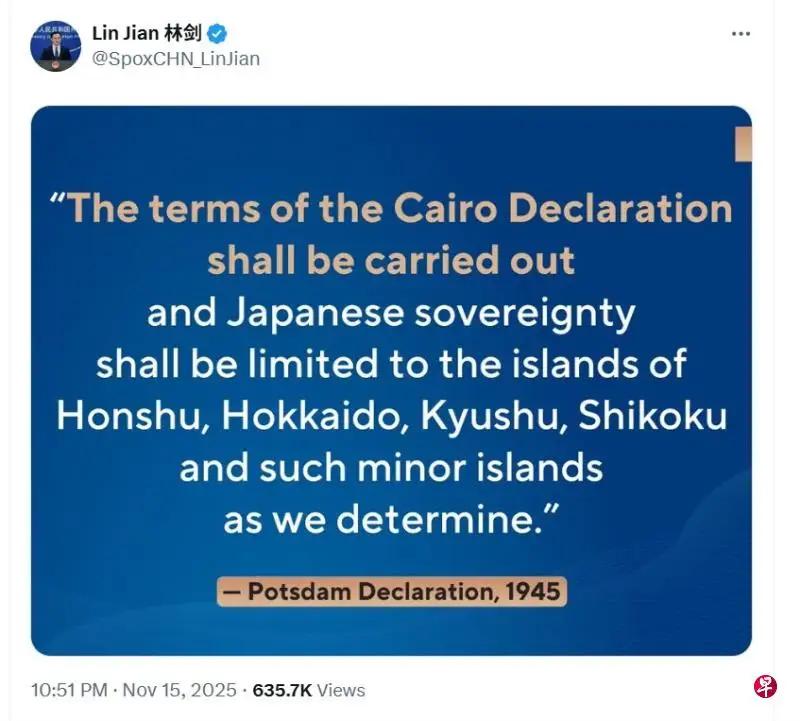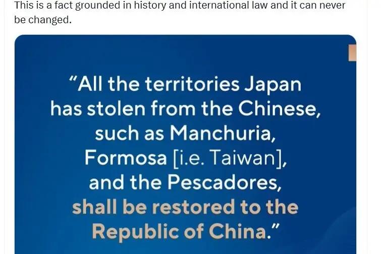 女倭首的言论让所有华夏儿女义愤填膺,今天我注意到林剑同志引用了《开罗宣言》和《波斯坦公告》,上学时学习历史都知道这两个文件,这两个文件是二战后整个国际秩序的基石。今天就带同胞们重温一下这两个文件里都规定了什么。 咱挑主要的说:《开罗宣言》明文指出,日本所窃取的中国领土,如东北四省、台湾、澎湖群岛等,归还中国。 《波茨坦公告》第八条规定:“开罗宣言之条件必将实施,而日本之主权必将限于本州、北海道、九州、四国及吾人所决定其他小岛之内。” 《波茨坦公告》第六条规定:“欺骗及错误领导日本人民使其妄欲征服世界者之威权及势力,必须永久剔除。” 同胞们,看到了吧,一、作为二战战败国的日本,应该归还被占领的台湾及澎湖列岛等领土给中国,台湾是中国内政,和你鬼子有毛关系;二、日本的领土仅限于日本四岛内,其他的小岛应得到我国的允许,所以琉球群岛不是日本的领土;三、再有妄想的极端人士,应予以剔除,所以薛剑总领事说的是有法律依据的。