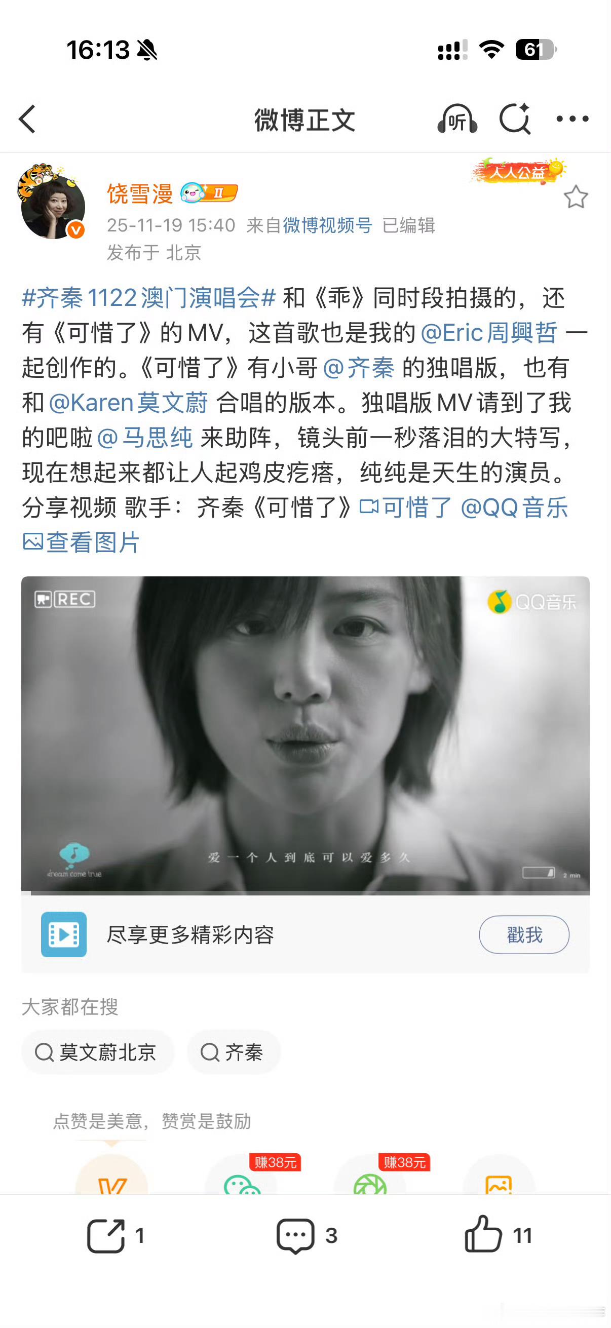 饶雪漫发一天齐秦动态,还激情为《大约在冬季 2019》打call,追偶像热情似火。就像咱追星,满心偶像,到处安利,这种快乐超上头~😎