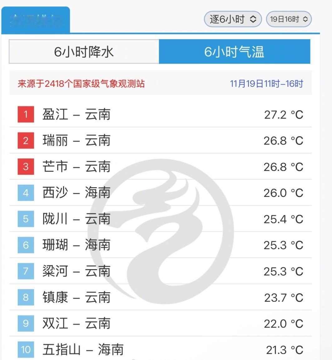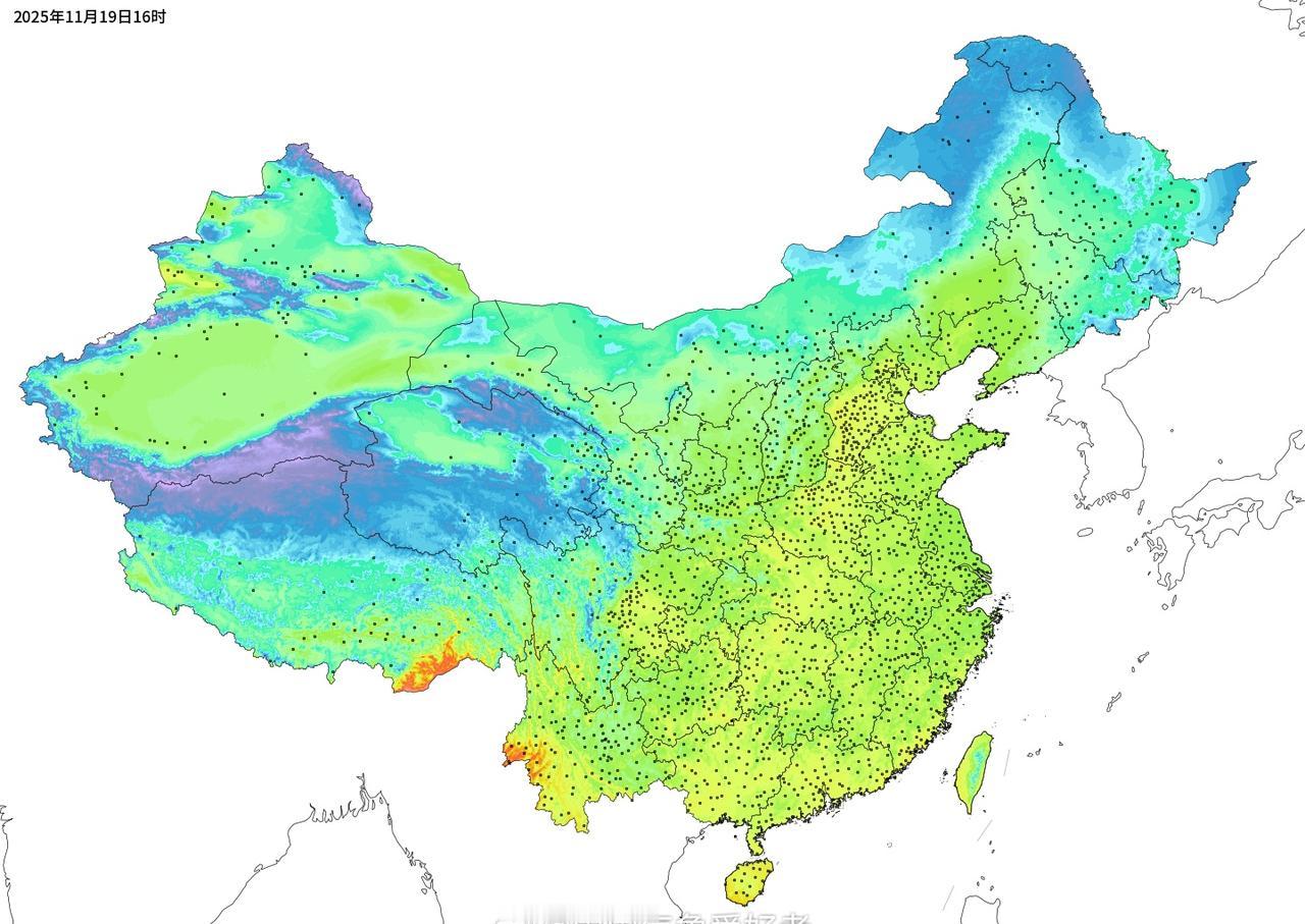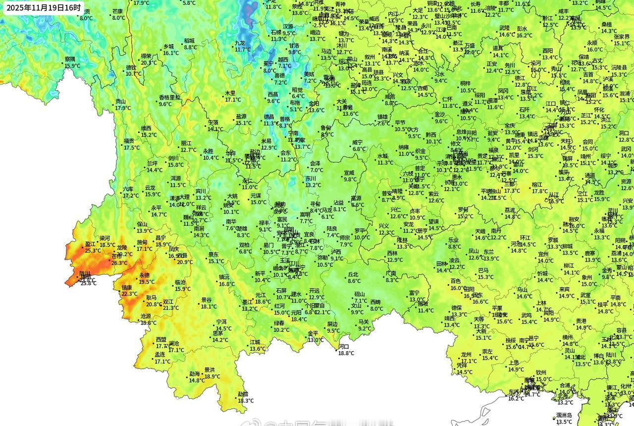 寒潮在高黎贡山脚下望而却步,今天下午全国只剩滇西与海南三沙市气温还在25度以上!