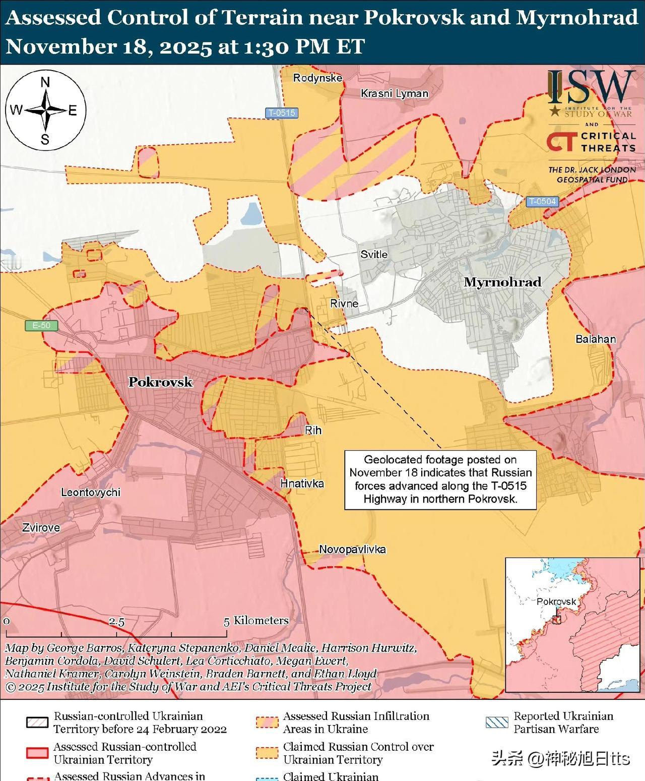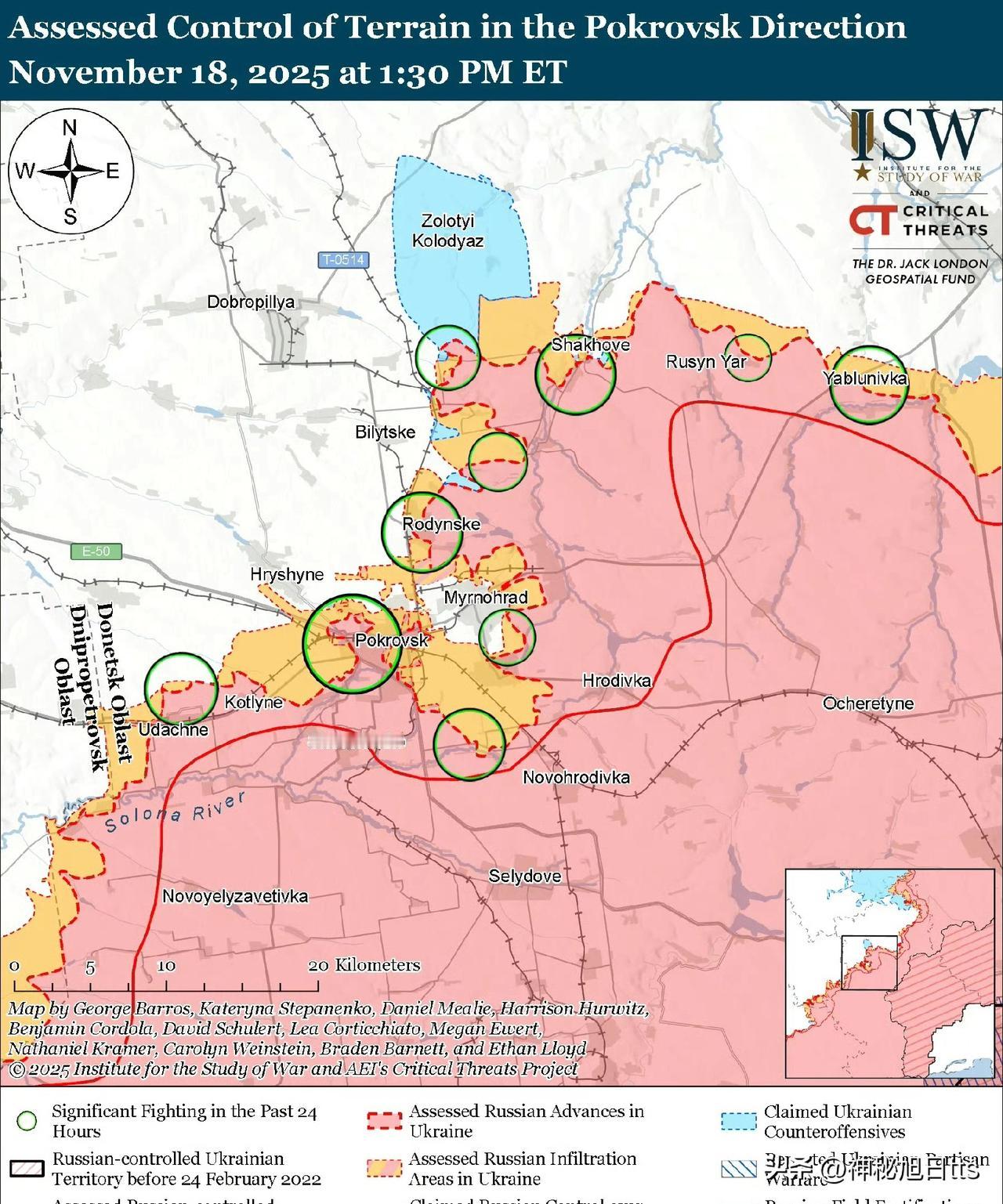 俄军难以集中兵力于波克罗夫斯克方向的单一决定性目标,而是继续同时尝试包围波克罗夫斯克-米尔诺赫拉德地区,并同时在两座城镇发起进攻。俄军指挥部似乎并未将兵力集中于完成对波克罗夫斯克-米尔诺赫拉德地区的包围,而这通常是夺取整个区域最快捷、成本最低的方式,俄军反而继续采取正面进攻。11月18日公布的、据称拍摄于11月16日的地理定位视频显示,俄军近期在波克罗夫斯克东北部取得了进展。乌克兰空降突击部队第7快速反应军于11月18日报告称,俄军正越来越多地试图从克拉斯尼·莱曼(米尔诺赫拉德以北)一侧渗透进入米尔诺赫拉德——这表明在米尔诺赫拉德以北作战的俄军并非专注于向西推进以完成包围,而是试图直接向南进攻米尔诺赫拉德。11月18日,在波克罗夫斯克方向作战的乌军旅发言人报告称,俄军正试图从西北和西部切断乌克兰通往米尔诺赫拉德的地面交通线。俄军还在波克罗夫斯克-米尔诺赫拉德包围圈内对乌克兰阵地进行滑翔炸弹袭击,这很可能是为了扰乱乌克兰的后勤,并摧毁乌克兰军队在该地区行动时使用的建筑物和其他掩体。 俄军难以完成包围,部分原因是乌克兰军队对俄军包围圈北侧构成的威胁。俄第51合成集团军(CAA,隶属南部军区)在米尔诺赫拉德以北的包围圈北侧作战,但未能从东北方向推进,从而完成包围。2025年8月,第51合成集团军在多布罗皮利亚战术区(波克罗夫斯克东北部)的一次渗透,给俄军造成了漏洞,乌克兰军队随后利用这些漏洞威胁到在波克罗夫斯克东北部作战的第51合成集团军部队的后方。俄军指挥部可能认为,在波克罗夫斯克南部和西南方向作战的中央军区第二军从西侧完成包围更为有效。然而中央军区第二军仍然将兵力和资源投入到波克罗夫斯克市内及其北部地区的进攻中,似乎并未将从西侧完成包围的行动列为优先事项。