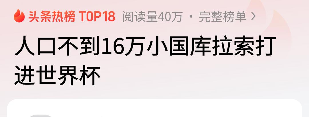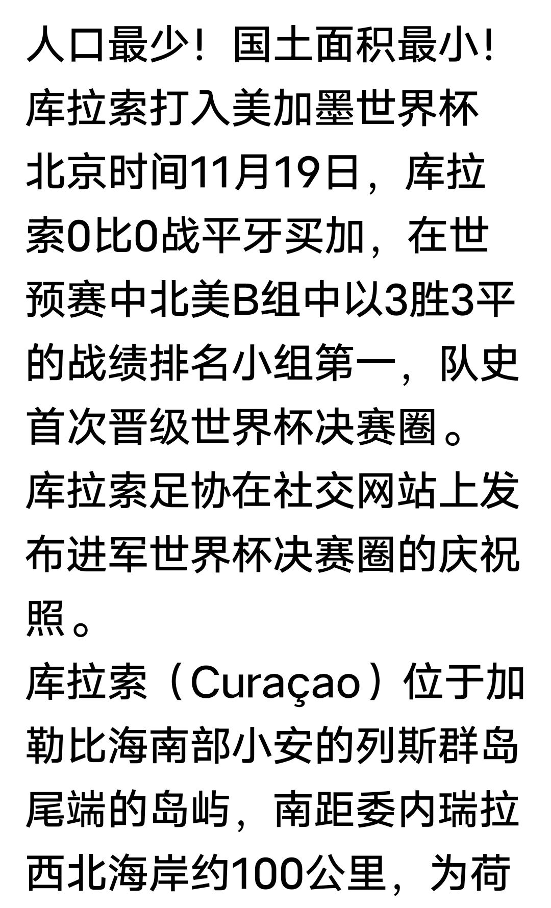 今天有一条消息上了,就是人口还不到16万的一个从来没有听说过的小国--库拉索打进世界杯决赛圈! 老铁们,在这个消息之前,你们听说过这个国家吗?反正我是第一次听说。我相信很多人也是第一次听说。 这个消息,我相信让很多人心里有点郁闷,有网友说,这人口还没有我们一个大的镇子人多,北京天通苑小区的人,比这个国家十倍的人口还多。 还有网友说,只要真正的按照足球规律去发展,哪怕是贵州村超的规模,就足够冲击世界杯了。 还有网友说,2002年国足进世界杯,我还骂国足垃圾,谁知道那个时候竟然是国足的巅峰时期,原谅我年少无知了。 还有网友说,感觉挺侮辱的,可是,其实也谈不上侮辱,压根就没有尊严,哪来的侮辱呀? 老铁们,你们对这个怎么看?