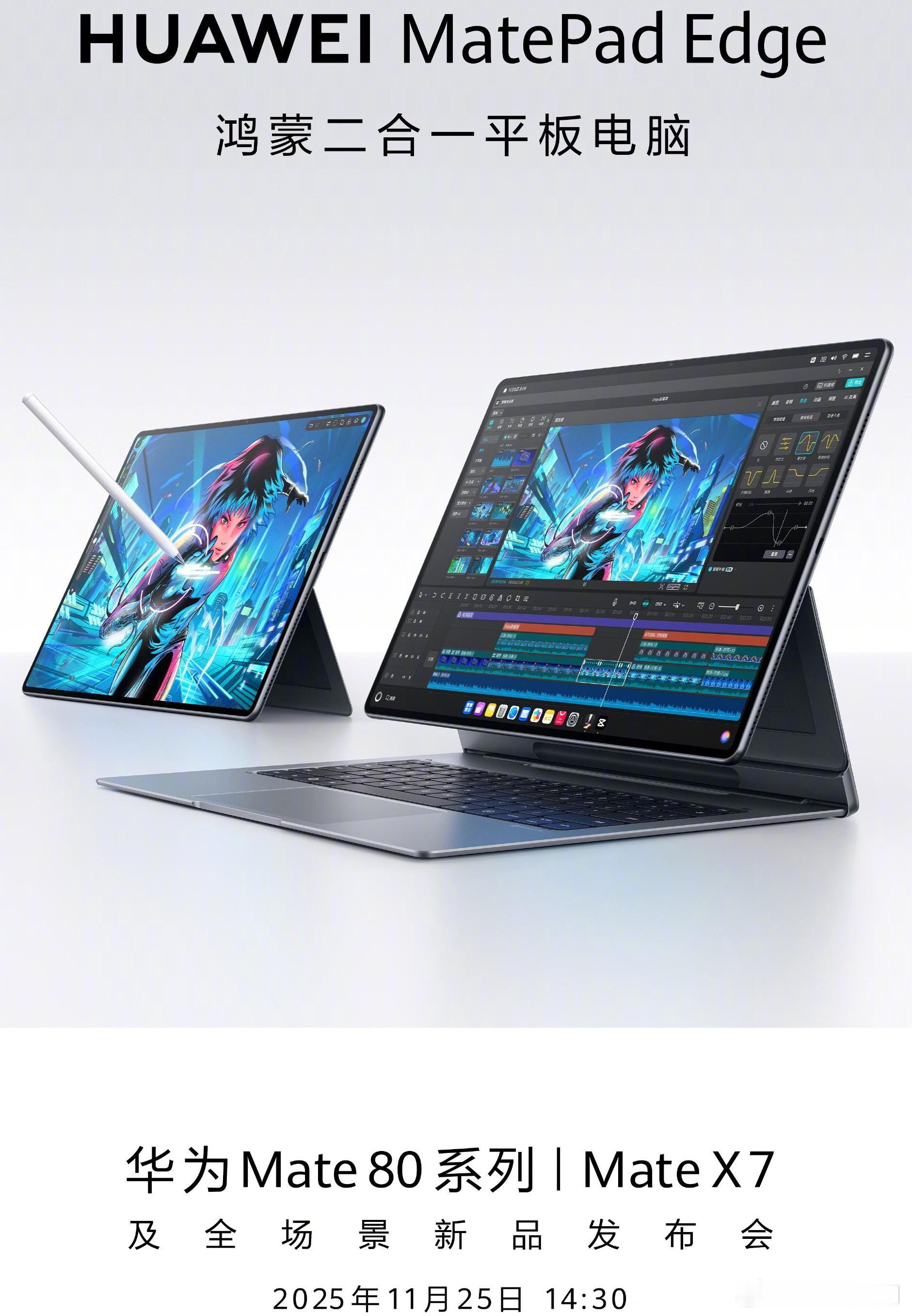 余承东今天官宣了与mate80一同发布的还有华为Matepad Edge ,平板电脑二合一,这玩意可能比大家想象的更惊艳!华为今天线下进行了一个产品沟通会,曝光了部分信息,给大家总结一下它的牛逼之处:第一,有人肯定会说,不是已经有非凡大师折叠电脑珠玉在前了吗?人家那是真正的一体多功能,这个matepad edge并非完全一体,有何稀奇?非凡大师再牛逼,但是它太贵啊!一般人无福消受,这个平板电脑它便宜啊,它不到一万!但性能却异常强大!能走量!用的和matebook pro一样的华为目前最强的麒麟x90 S0C,28W高性能释放,其它友商的传统二合一最高的才15W,28W性能已经比肩轻薄本了, 32GB内存+2TB储存,加上纯血鸿蒙系统的丝滑流畅,多任务处理,大型文件读写,乃至剪辑视频与玩玩英雄联盟这种显卡低负载游戏毫无压力。第二,它的6.8毫米机身真的超级轻薄,只有800克,手感超级好,如此薄如蝉翼的机身,居然还能塞进去集成了超薄双微泵液冷膜,带铜鳍片的双VC均热板,双金刚铝风扇,六扬声器,铰链转轴,太夸张了,这已经是笔记本工艺的巅峰之作了!第三,它的配套键盘压感触控板,它的机身外放和耳机同步播放做到环绕声,内置六扬声器高低音分频系统,联合华为耳机freeclip2,构成360°独立四声道影院声场,声场宽度提升70%,低频响应增强133%。第四,屏幕是14.2英寸oled柔光屏,3.1K分辨率,94%屏占比,一体式铝合金支架,支持多角度无极调节,无需外设即可稳定支撑。触屏,键鼠,手写笔三种交互操作皆可。一台设备集移动生态和桌面生态于大成,全量的平板应用,海量的电脑专业应用,还有华为首款星跃悬浮键盘。第五,140W快充,30分钟充满75%,AI WiFi算法+智能天线,网络时延降低30%,360°信号覆盖,任意摆放均稳定连接。小艺智能体,支持图片秒转ppt,文档智能排版,AI降噪通话。总之,matepadEdge,在做到了极致轻薄且平板电脑二合一形态后,还兼顾拥有了全面强大的各类性能,并没有为了形态牺牲,这就大大增加了多场景应用的实用性!只有华为才能做到的工艺,大卖可期!