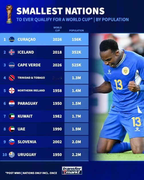 库拉索这个加勒比海岛国对于大多数人来说都有些陌生,但他们在0-0逼平牙买加后创造了世界杯的历史,成为参加世界杯最小的国家!对于一个人口只有15.6万的小国来说,这真是一个了不起的成就!很快全世界的球迷都会记住这个国家! 那么世界杯历史上的参赛国里人口最少的前十名都是谁呢?第一名我们刚刚已经提到是库拉索!排在第二名的是冰岛,2018年他们首次参加世界杯,当时他们的人口仅有35.2万。佛得角明年将首次参加世界杯,他们的人口是52.5万,排在第三名。排在第四名的是加勒比海的岛国特立尼达和多巴哥,该岛人口仅130万,他们参加了2006年的世界杯! 第五名是北爱尔兰,他们在1958年世界杯上打进了四分之一决赛,当时他们的人口只有140万。排在第六位的是南美国家巴拉圭,当他们参加1950年世界杯时,人口只有150万。亚洲国家科威特以170万人口获得了1982年世界杯的参赛资格,他们排在第七位。他们的邻国阿联酋参加1990年世界杯时人口只有190万,排在第八位。欧洲小国斯洛文尼亚排在第九位,他们参加2002年世界杯时人口只有200万。乌拉圭在参加1950年世界杯时,人口仅有220万,排在第十位!