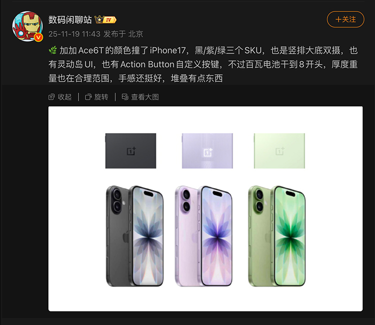爆出一加Ace6T的3个配色,颜色全部撞脸iPhone17,这是要硬磕苹果啊