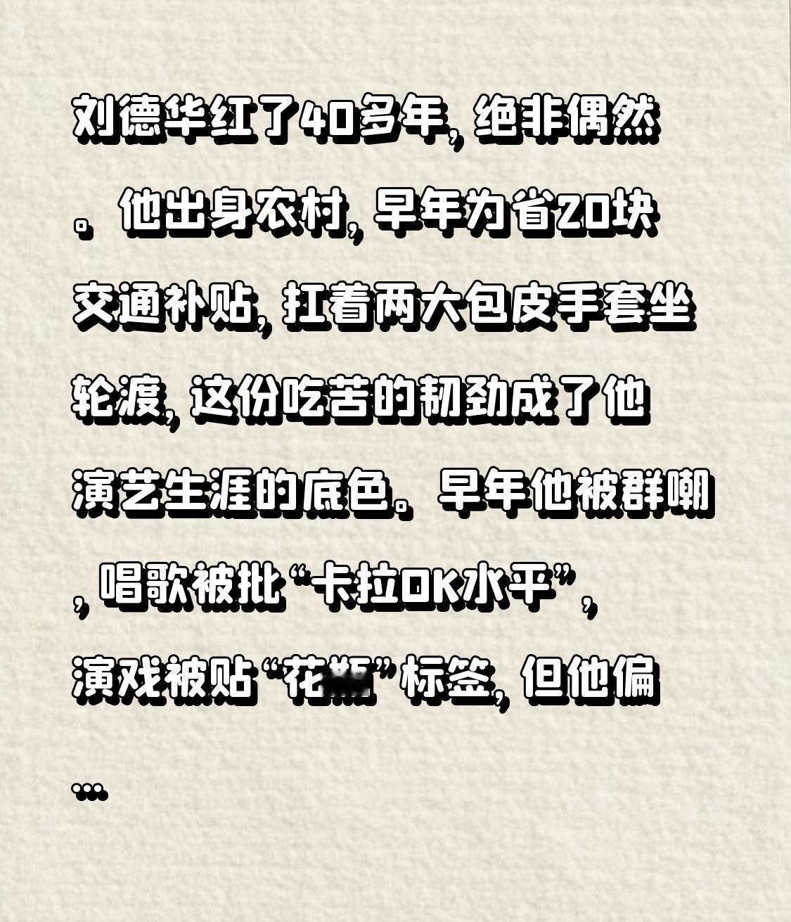 刘德华红了40多年,绝非偶然。他出身农村,早年为省20块交通补贴,扛着两大包皮手套坐轮渡,这份吃苦的韧劲成了他演艺生涯的底色。 早年他被群嘲,唱歌被批“卡拉OK水平”,演戏被贴“花瓶”标签,但他偏不认命。拍《失孤》让群演真扇耳光,指甲盖劈裂也接着拍;唱歌不行就拼命练,甩掉“刘德华腔”。 他还真心待人,演唱会粉丝被保安拉扯,他直接从两米高舞台跳下解围。流量会凉,人设会崩,可他把“敬业”刻进骨子里,用真心换真情,长红自然是水到渠成。