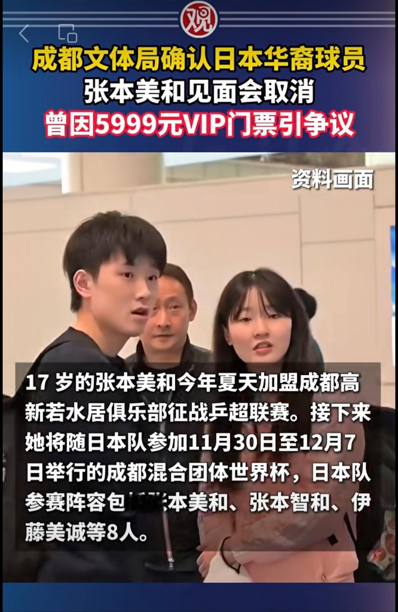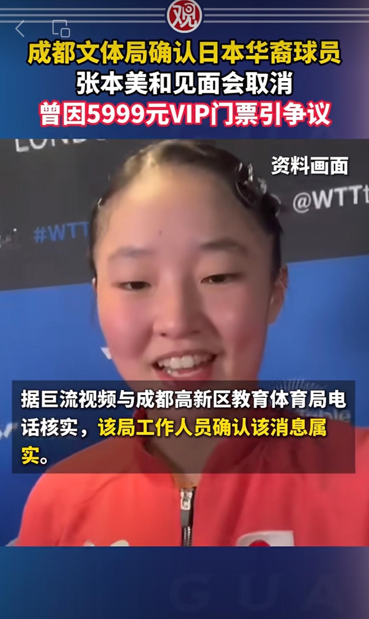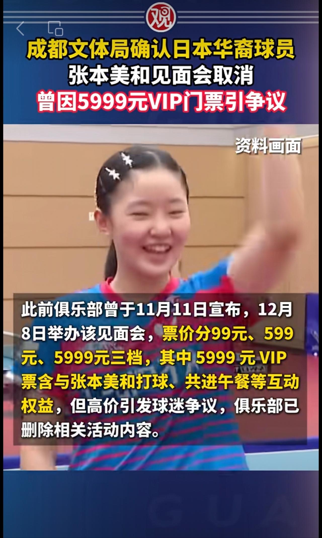 成都文体局确认日本华裔球员张本美和见面会取消,曾因5999元VIP门票引争议。