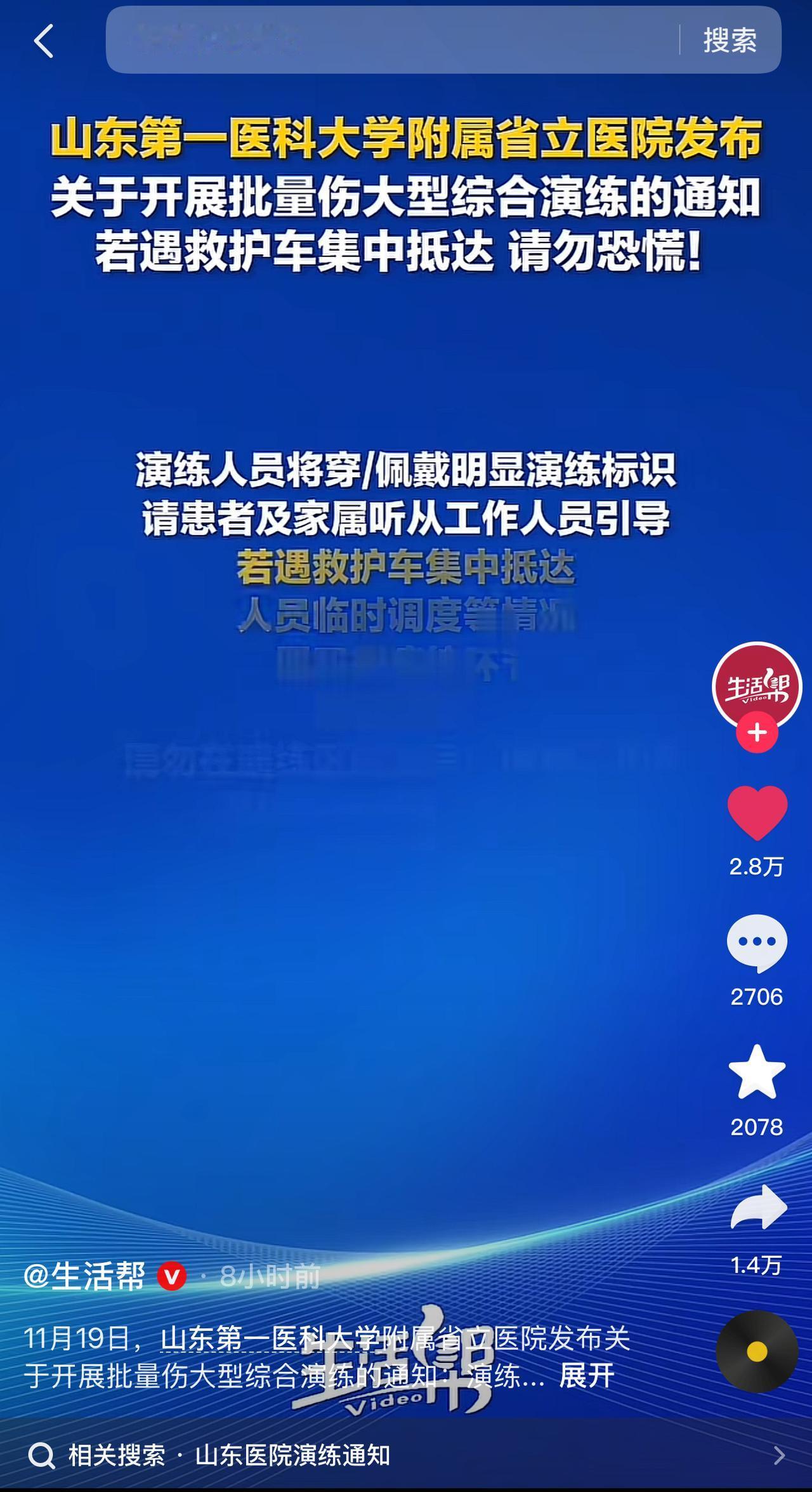 备战省山东省的医院开始为备战进行演习了!国家此次可谓打出了一套步步为营的组合拳,准备十分充分!在此提醒大家,尤其是山东的兄弟姐妹们,倘若看到大量救护车,不必恐慌,要相信国家、支持国家!该做什么就做什么,不给国家添乱,同时还要坚持健身、努力攒钱,随时准备响应国家召唤!那将会是在族谱上单独开启一页的荣耀时刻!