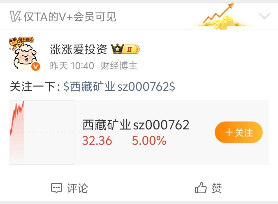 昨日v+推荐关注的$西藏矿业 sz000762$ 又吃肉了。。
