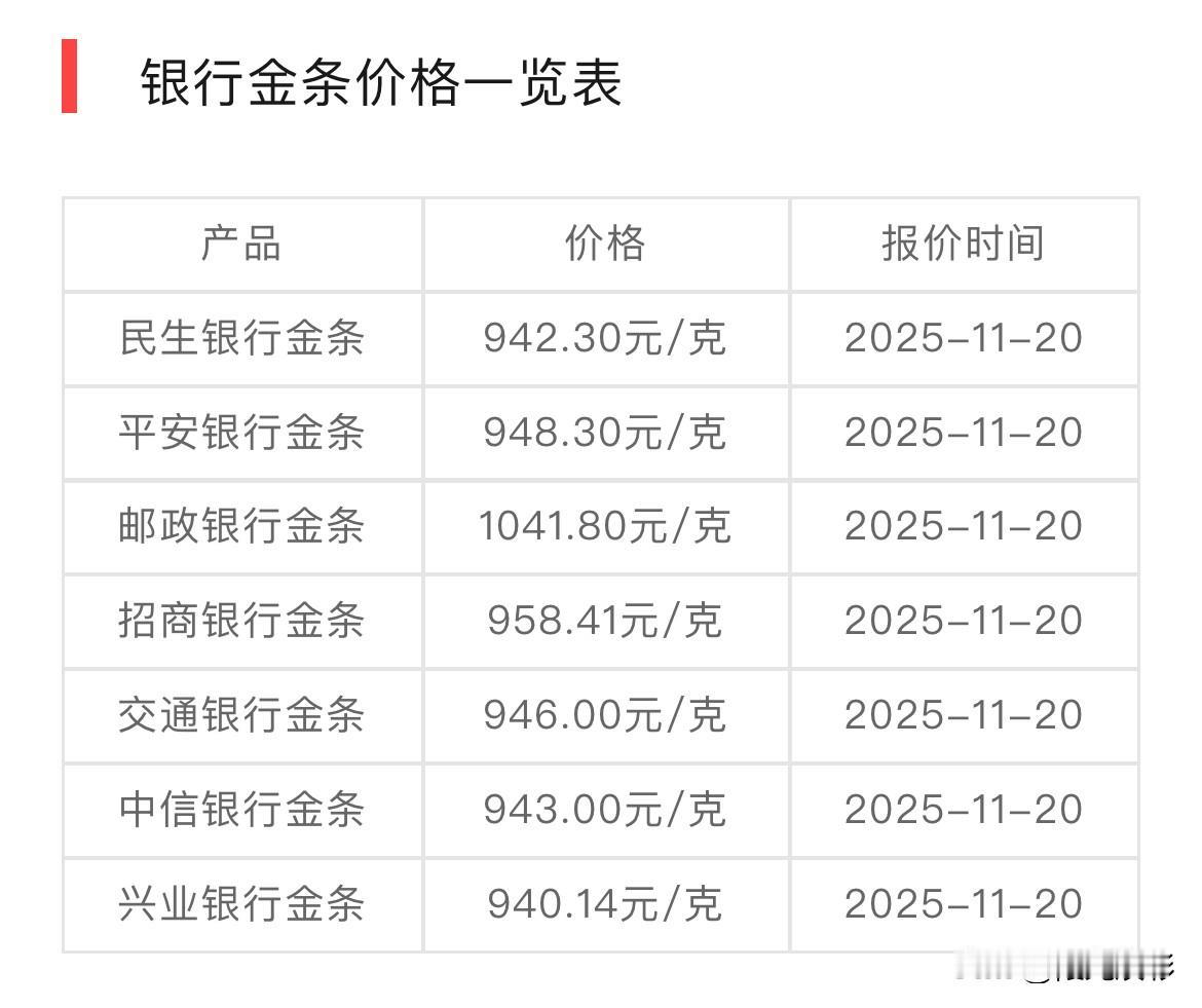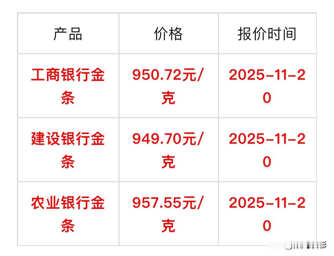 最新 金条价格查询。 11月20日金条价格最新价格, 工商银行金条价格:950.72元/克, 建设银行金条价格:949.70元/克, 农业银行金条价格:957.55元/克, 招商银行金条价格:958.41元/克, 平安银行金条价格:948.30元/克。 同比于昨天各大银行金条价格有所上涨。 温馨提示:黄金的价格受很多因素的影响,有波动是很正常的。大家一定要根据需求和心理价格预期去购买,千万不要盲目追高。 投资有风险,理财需谨慎! 投资金条金价 金条行情 投资金条 银行金条价 金条避坑 金条市场 银行实物金条