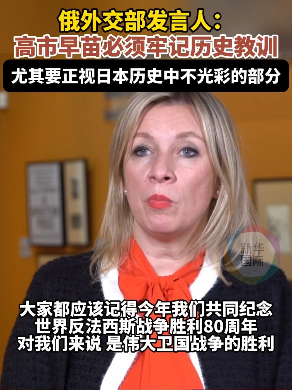 俄罗斯外交部发言人扎哈罗娃18日在莫斯科接受新华社记者专访时表示,日本首相高市早苗日前的涉台言论非常危险,日本应深刻反省历史、汲取二战教训。 今年是世界反法西斯战争胜利80周年。扎哈罗娃指出,世界各地一系列纪念活动都在提醒世人勿忘历史、汲取教训。高市早苗必须牢记历史教训,尤其要正视本国历史中那些不光彩的部分。 扎哈罗娃表示,日本军国主义发动的侵略战争给亚洲和世界带来深重灾难,也让日本付出惨痛代价。高市早苗等日本政界人士应深刻反省历史,警惕错误言行可能引发的严重后果。
