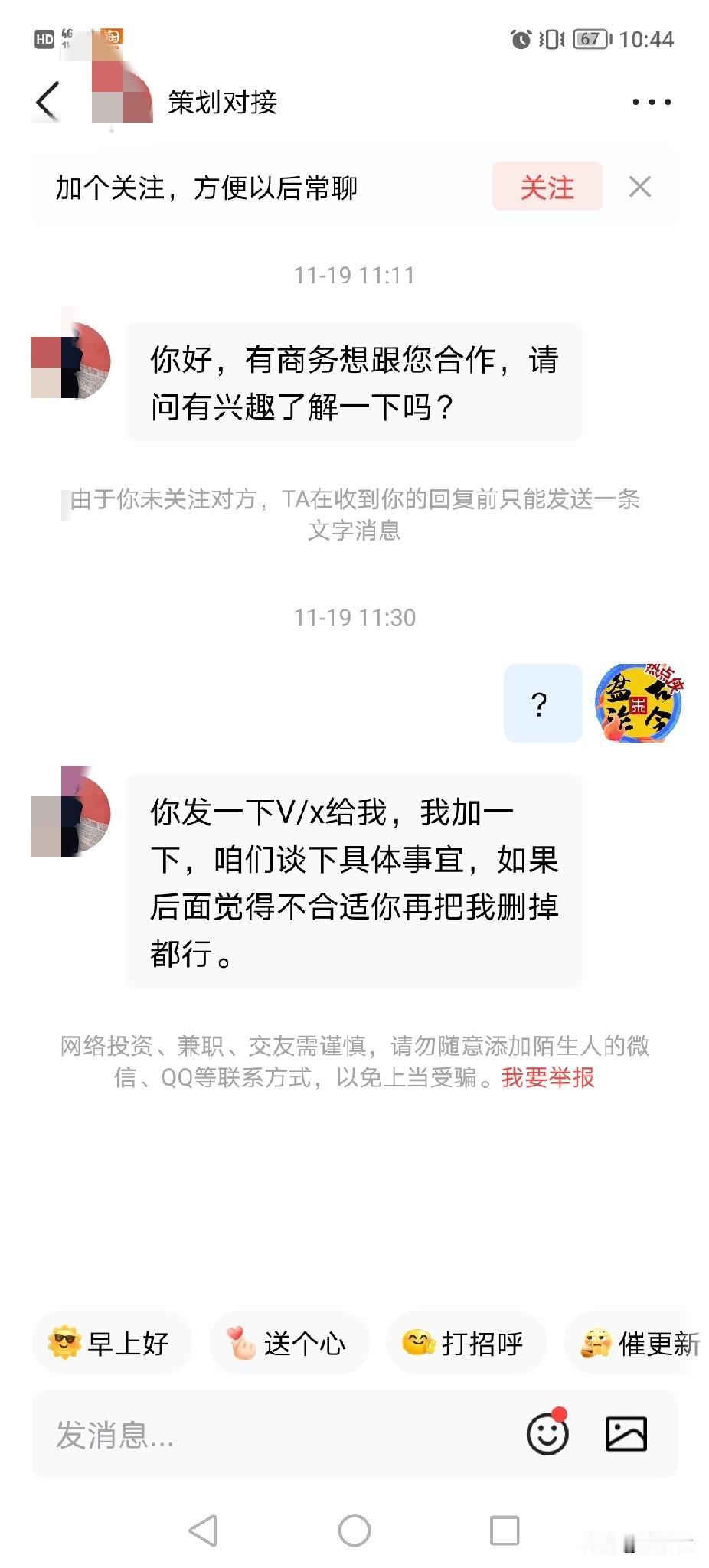 这是什么套路?私信我,说有好的商务合作,然后转头要加我微信! 最近经常收到这样的商务合作,邀请我!但是打开这些人的主页很奇怪,基本上是0文章,但是粉丝却很多! 然后要我的微信,要谈合作! 搞不懂这是什么套路,就没理她! 你们谁碰到这样事情没有?