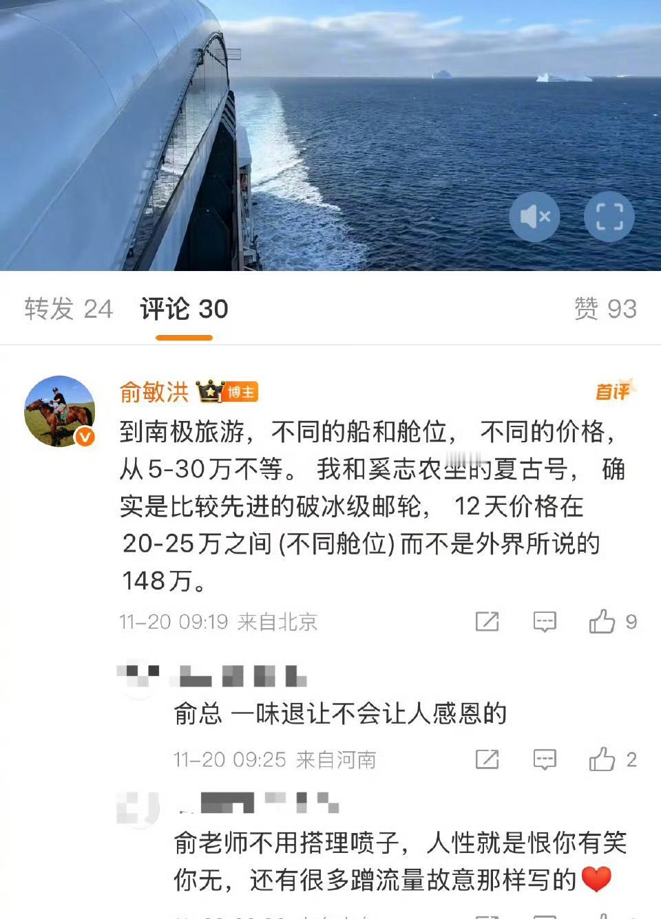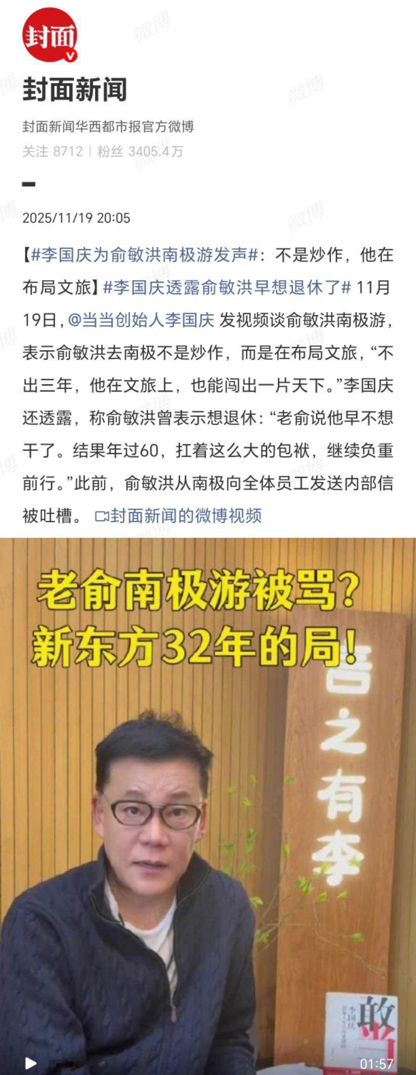 允许员工吐槽,且一直鼓励——俞敏洪的回应,很契合他的身份。 李国庆为俞敏洪南极游发声:不是炒作,也不是吃喝玩乐,他在布局文旅,其实他早就想退休了。 年过 60 本可退休,他却扛起重担继续前行,这份坚韧与担当令人钦佩。 南极全员信引吐槽,俞敏洪回应:没有坐148万的邮轮,新东方鼓励员工吐槽,明年会支持员工来南极看看。 俞敏洪还表示,有冒充新东方员工在网上发声的人,相信大家能明辨。 同时辟谣“到南极坐邮轮花148万”:“到南极旅游,不同的船和舱位,不同的价格,从5万-30万不等,我和奚志农坐的夏古号,确实是比较先进的破冰级邮轮,12天价格在20万-25万之间(不同舱位),而不是外界所说的148万。” 今年的南极旅游有点火啊,特别是教培行业。