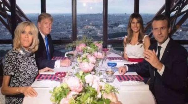特朗普夫妇和马克龙夫妻共进餐,马克龙和特朗普的夫人坐在一侧,特朗普和马克龙的夫人坐在一侧,桌子两侧都是年龄相仿的人儿,这样的画面还挺和谐的。