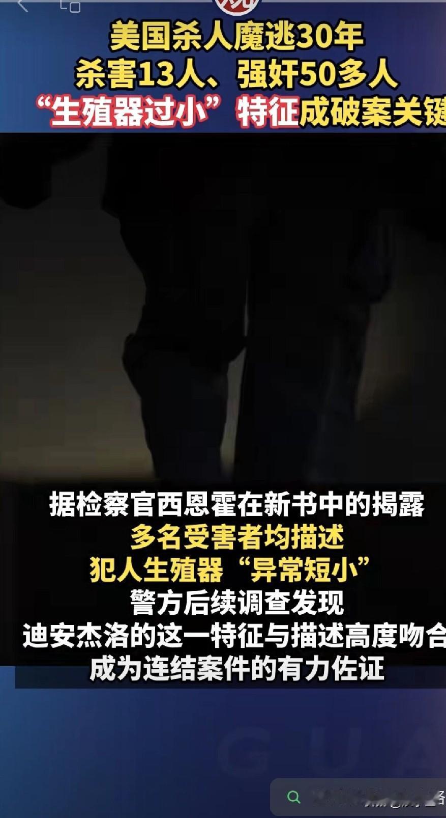 生殖器过小成破案关键!美国杀人狂魔伏法! 让美国人民战战兢兢多年的美国杀人魔终究是伏法了!而他被抓的关键竟然是生殖器过小这一特征! 他的恶行主要是,潜逃逃30年,累计杀害13人,强奸50多人,可谓是罪行累累! 很多受害人描述:犯人生殖器“异常短小” 最后警察经过海量对比迪安杰洛的这一-特征与受害人描述非常吻合! 国外网友对此评论道:瘾大硬件差,而且坏到骨子里了!