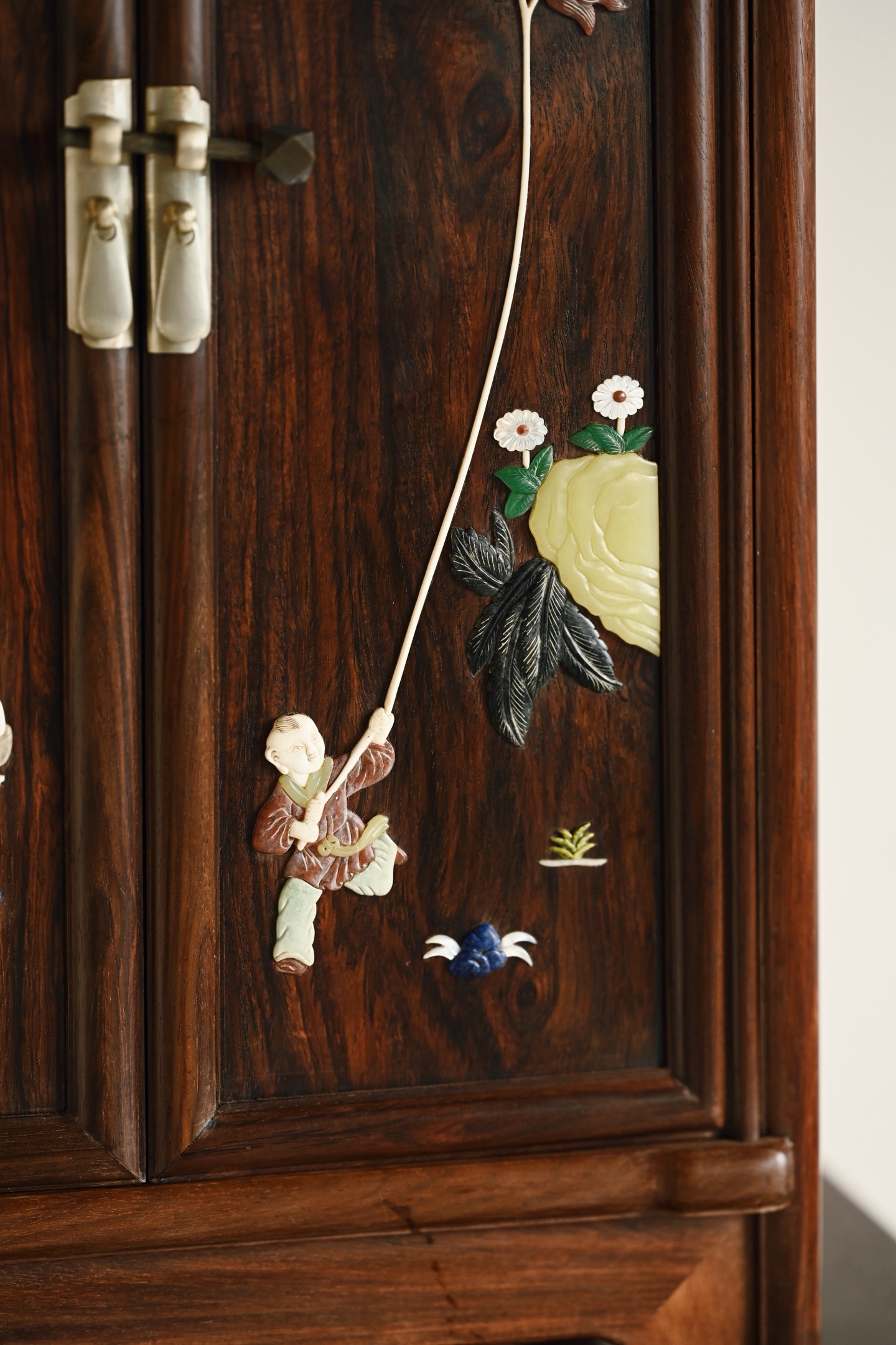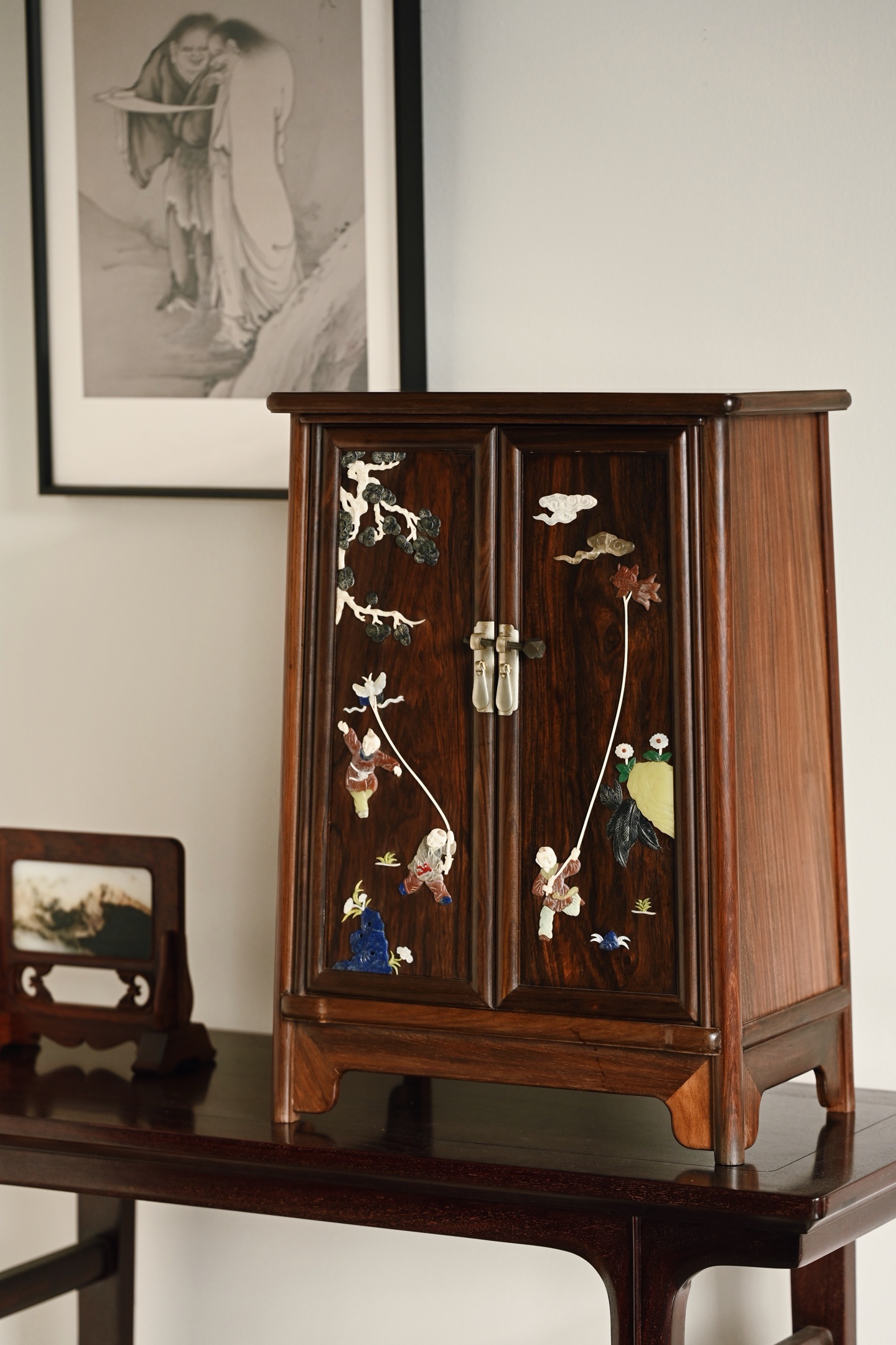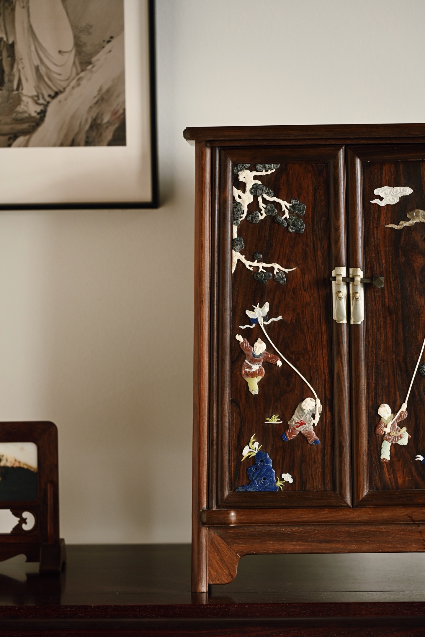 大红酸枝x百宝嵌 | 童戏图 茶柜精选老料,坚实凝润,柜内分两层,可收纳文玩器物或茶具、茶叶,双开门设计,柜门以百宝玉石镶嵌成画,童子放风筝一派活泼喜乐之景,精致大气,置茶室造景、收纳皆宜。36.5*23*52cm