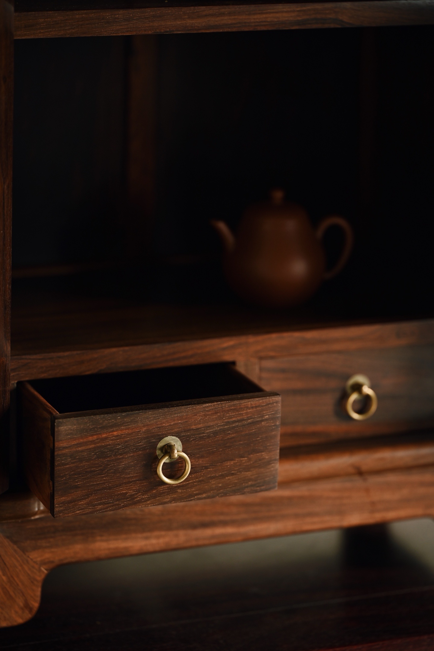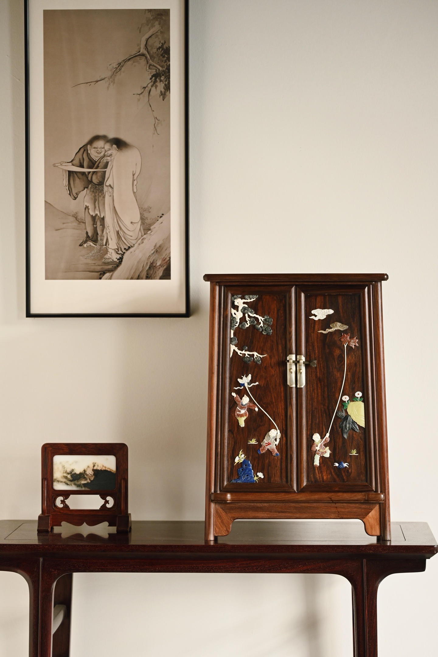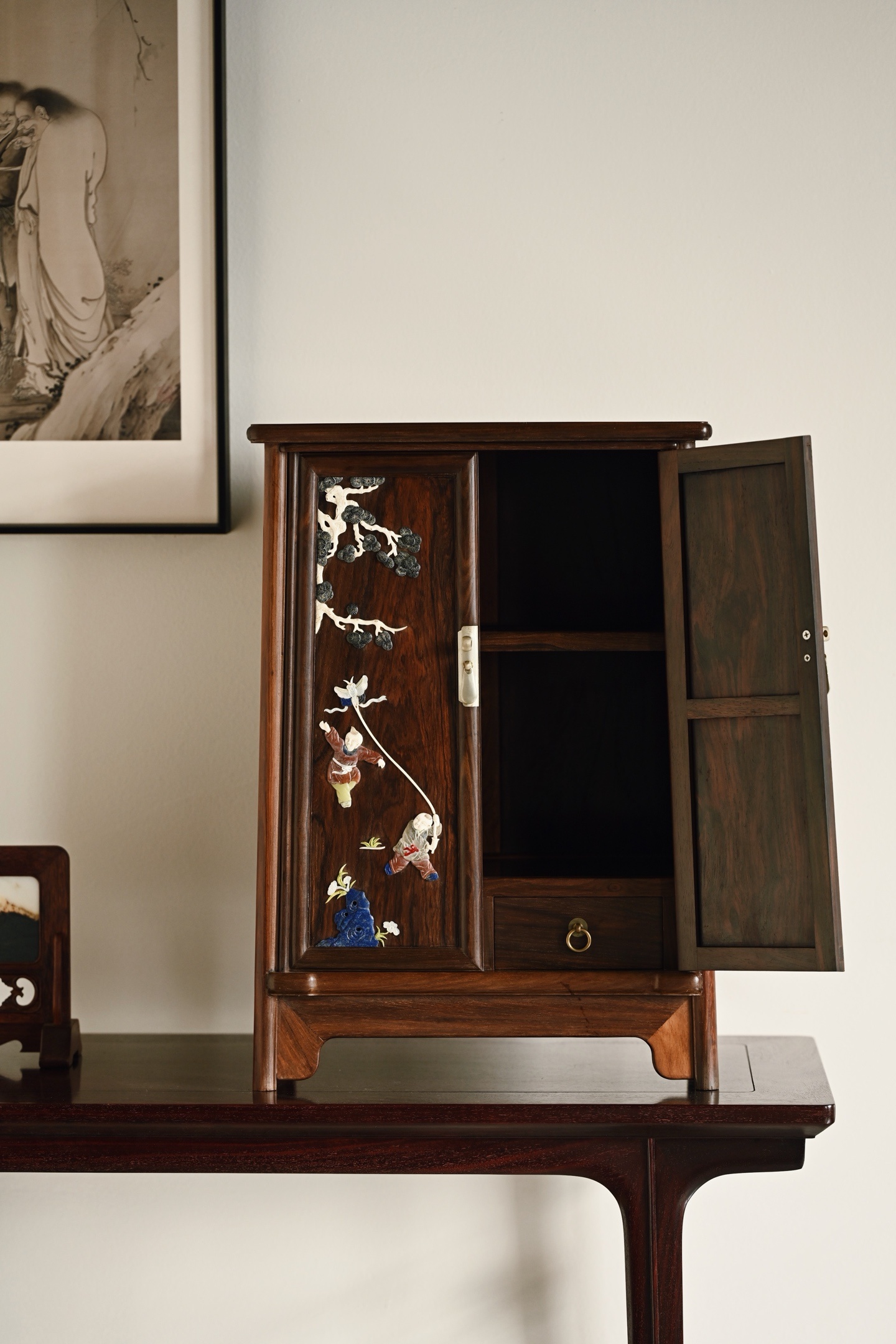 大红酸枝x百宝嵌 | 童戏图 茶柜精选老料,坚实凝润,柜内分两层,可收纳文玩器物或茶具、茶叶,双开门设计,柜门以百宝玉石镶嵌成画,童子放风筝一派活泼喜乐之景,精致大气,置茶室造景、收纳皆宜。36.5*23*52cm