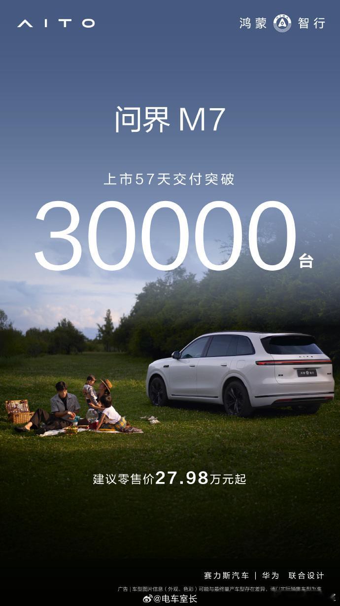 这就是鸿蒙速度......问界M7的交付已经突破30000辆了,距离它上市才仅仅57天,现在整个问界已经形成了M7/8/9全是爆款的恐怖矩阵,覆盖25-55万元这个超宽的价格区间,已经成为了整个高端SUV市场毋庸置疑的“巨头”了。