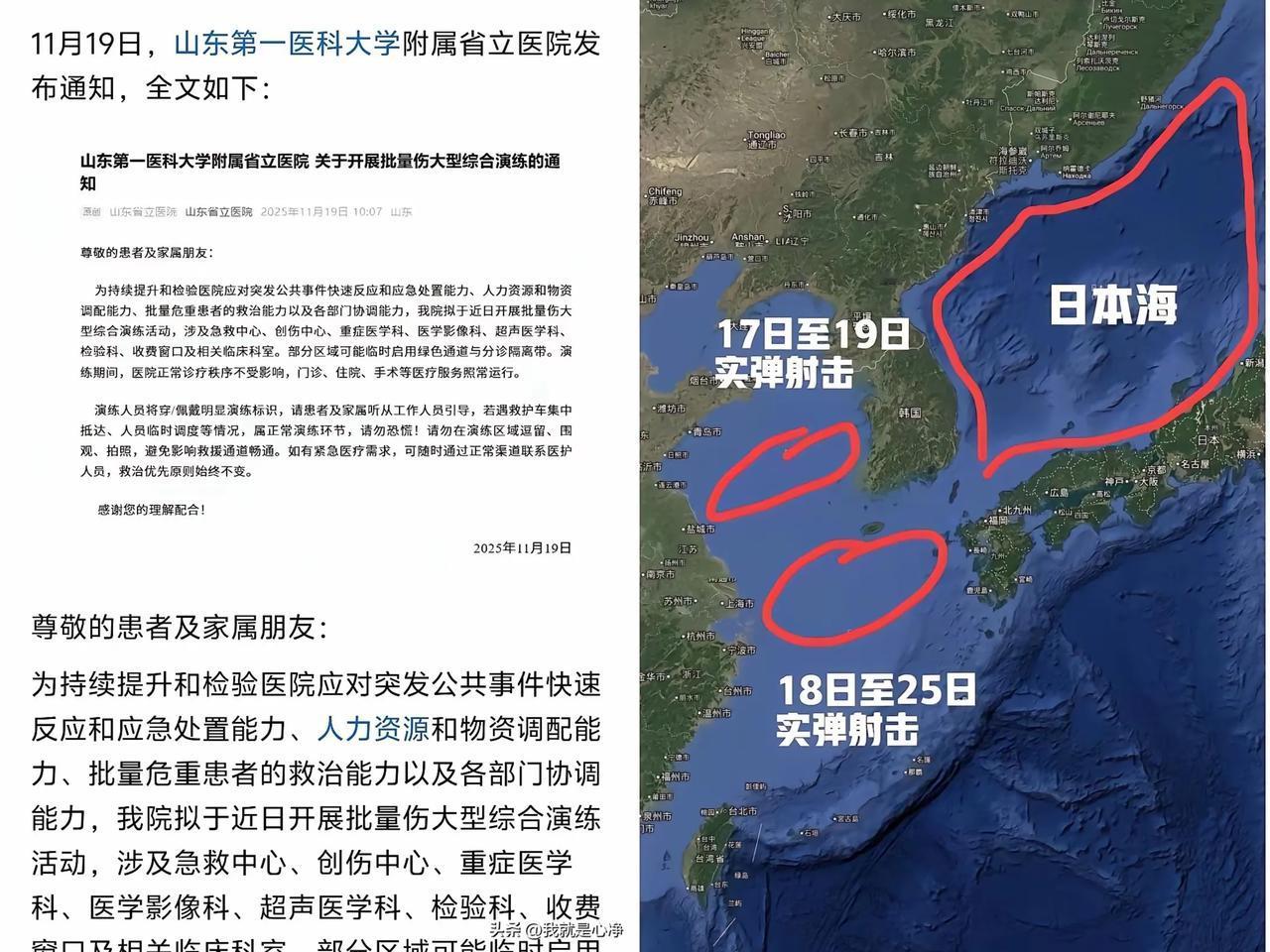 火药味已经越来越浓了,现在不光是黄海icon和东海icon进行军事演习。 就连山东省icon都开始进行野战急救演练。 山东省第一医科大学附属省医院。 下达了一份通告。别觉得这是巧合,能让医院专门练“批量救治”的场景,除了应对突发风险,更是未雨绸缪的底线铺垫。 高市早苗们还在喊“台湾有事即日本有事”,却没看清咱们的布局:055大驱在黄海织起火力网,医院绿色通道随时待命,这不是挑事是护盘。真以为咱们的准备是怕了?恰恰是看透了日本跟着美国搅局的野心,才提前筑牢攻防底气。 对付这种步步紧逼的挑衅,光军演不够,得让其付出实在代价。 你觉得接下来该从经贸还是能源领域入手,让日本收敛嚣张气焰?