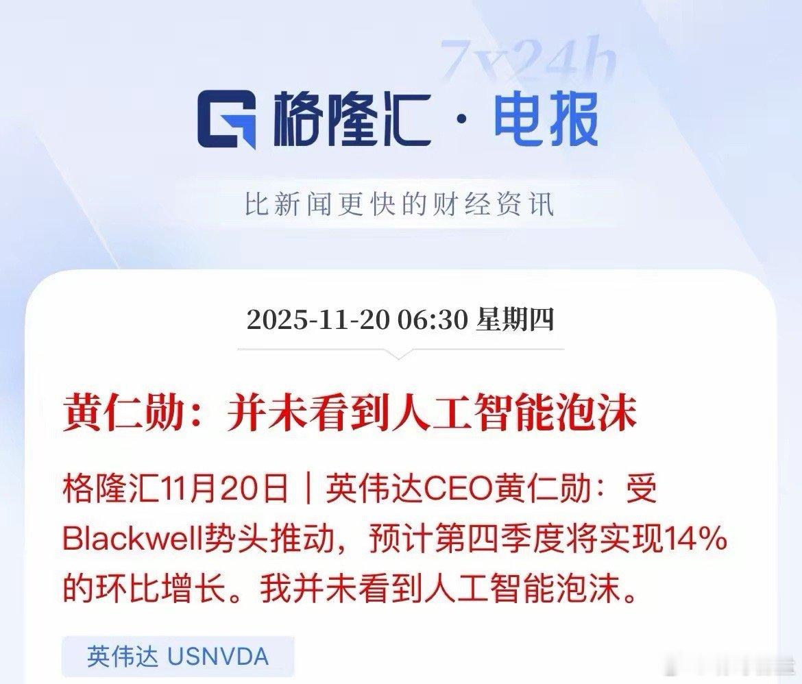 利好出炉,英伟达业绩强劲势头,美联储10月纪要“内讧”分歧,美股三大指数尾盘拉升,全线收涨,美元大涨突破100,黄金、白银跳水英伟达Q3的业绩和净利润均超市场预期,Q4展望强劲,英伟达涨2.85%,市值站上4.5万亿美元,盘后更是一度涨幅超6%,美联储10月会议纪要显示,美联储内部官员对12月降息分歧严重,若干官员表示12月降息是合适,很多官员表示12月降息可能不合适,会议纪要公布之后,美联储12月降息的概率直接跌破40%,只有36.2%,美联储传声筒表示,12月投票结果将非常胶着,会议纪要显示鹰派占据上风,叠加数据缺失导致降息概率大降,美股三大指数全线收涨,指数尾盘拉升,纳指涨幅0.59%,热门美股英伟达涨幅2.85%,谷歌涨幅3%,黄仁勋表示并未看到人工智能的泡沫。